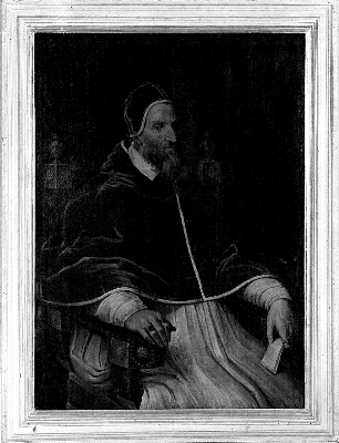 - NOTIZIE STORICO CRITICHE Il quadro è giunto a Poggio a Caiano prima del 1781 e impiegato per arredare la sala del primo piano della Fabbrica Nova, l'edificio costruito nel 1775 fra il muro di recinzione del giardino e la strada maestra. Nel 1812 si trovava già nell'edificio principale della villa, nel salone di Guardia,dal '18 nella camera n.9 del primo piano.Il dipinto fa esplicito riferimento al ritratto di Paolo III dipinto nel 1545 da Tiziano, ma potrebbe rappresentare un altro papa, dato che il volto presenta alcune varianti. La sua esecuzione è difficilmente databile proprio a causa dell'illustre riferimento