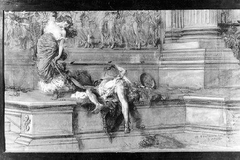 figura maschile sdraiata ai piedi di una figura femminile danzate, inseritein una architettura classica