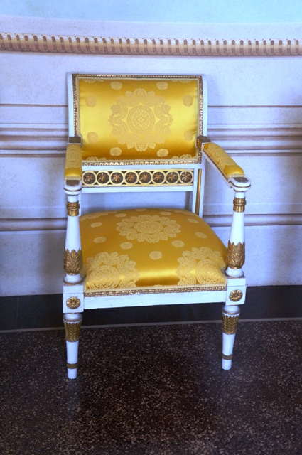 Le poltrone hanno le gambe anteriori e i supporti dei braccioli torniti e decoraticon giri di piccole foglie d'acanto. Le gambe posteriori, leggermente ricurveverso l'esterno, si inseriscono nei monanti della spalliera che terminano inuna piccola voluta. La spalliera, a sua volta, ha la parte imbottita posta sopra una traversa traforata a motivo di stelle entro cerchi. Sedile, spalliera e braccioli imbottiti con rivestimento giallo -oro decorato da rosoni grandi e piccoli