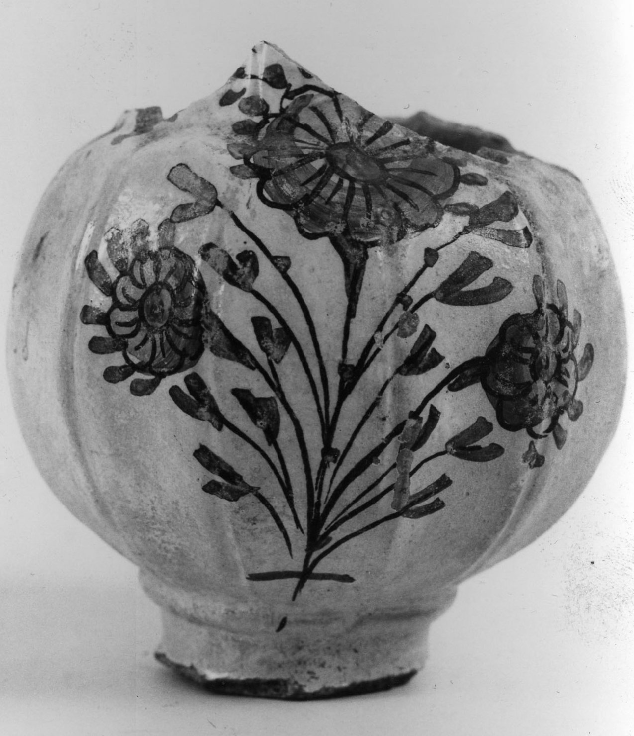 Frammento globulare con parete baccellata, di vaso ansato con piede sporgente mancanti