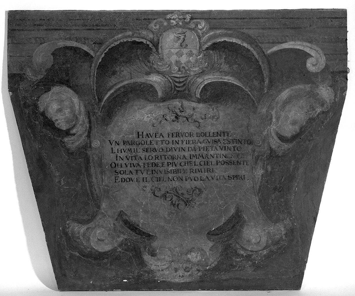 - ISCRIZIONI al centro - HAVEA FERVOR BOLLENTE / VN PARGOLETTO IN FIERA GVISA ESTINTO / L'HVMIL SERVO DIVIN DA PIETA' VINTO / IN VITA LO RITORNA IMMANTINENTE / OH VIVA FEDEE PIV CHE L CIEL POSSENTE / SOLA TV L'INVISIBILE RIMIRI / E DOVE IL CIEL NON PVO LA VITA SPIRI - corsivo - a penna -