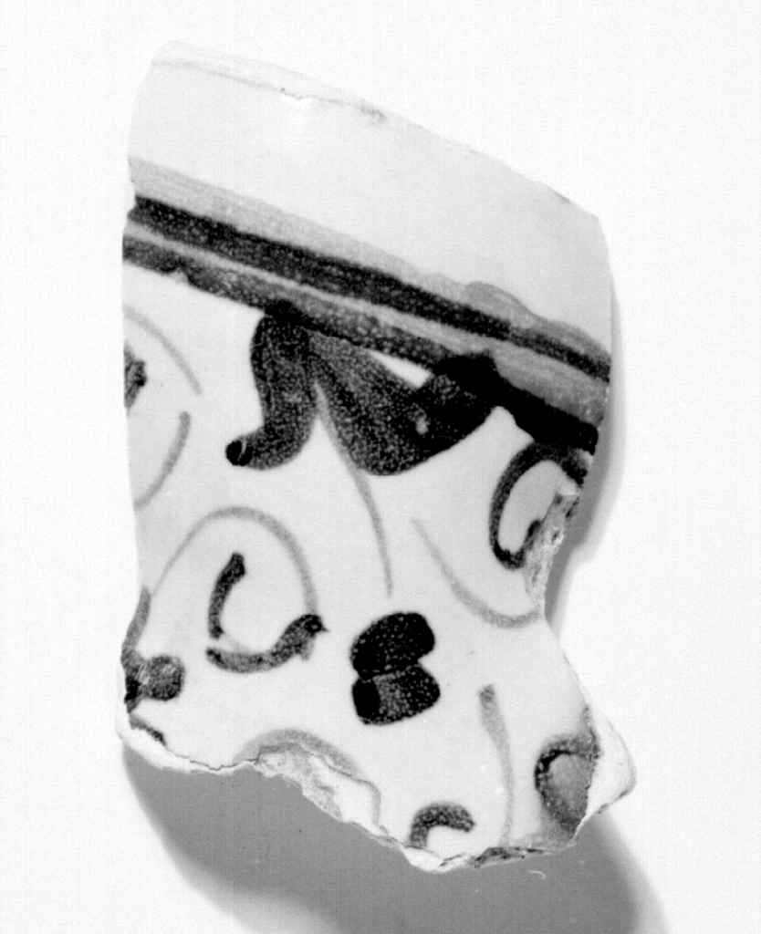 Frammento a fondo bianco con decoro a tralcio vegetale blu, verde e giallo