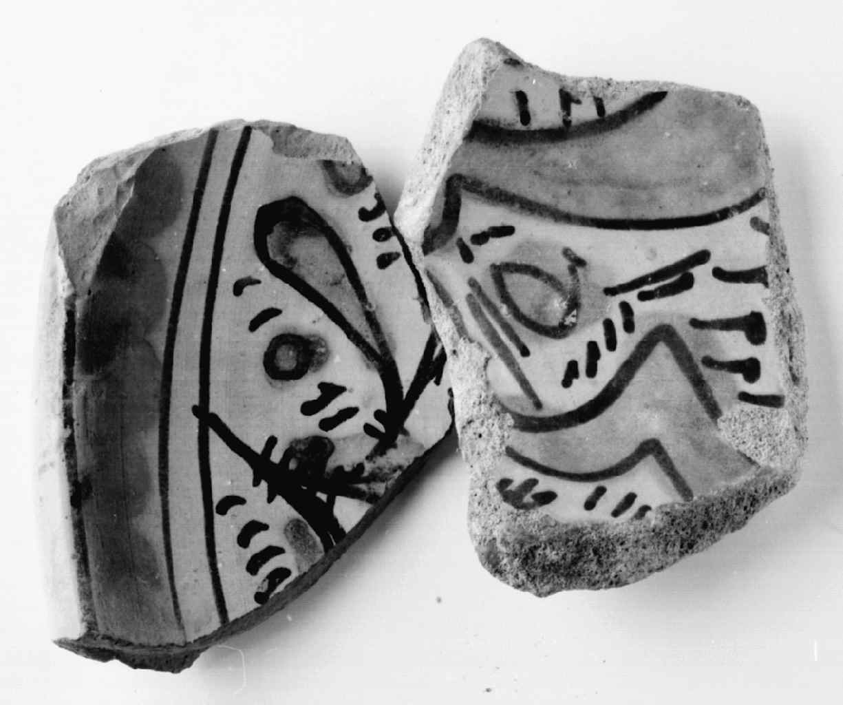 Due frammenti con decorazione vegetomorfa in verde ramina e bruno di manganese