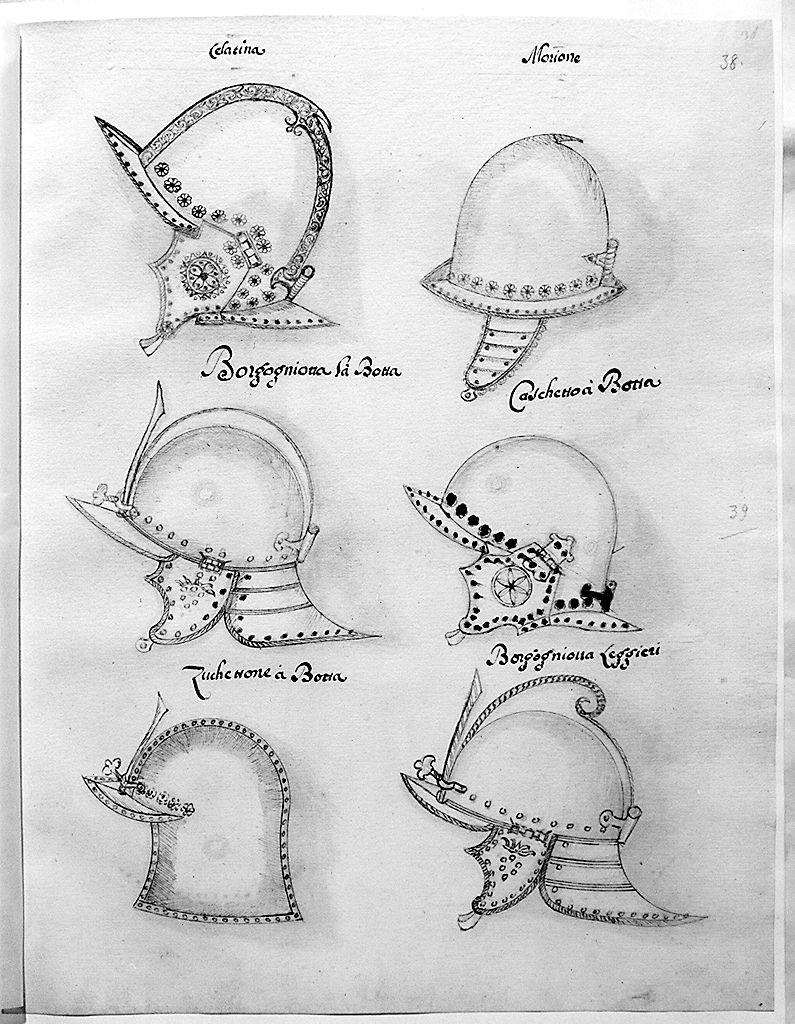 - ISCRIZIONI in corrispondenza di ciascun disegno - Celatina / Morione / Borgogniotta a Botta / Caschetto a Botta / Zuchettonea Botta / Borgogniotta Leggieri - corsivo - a penna -