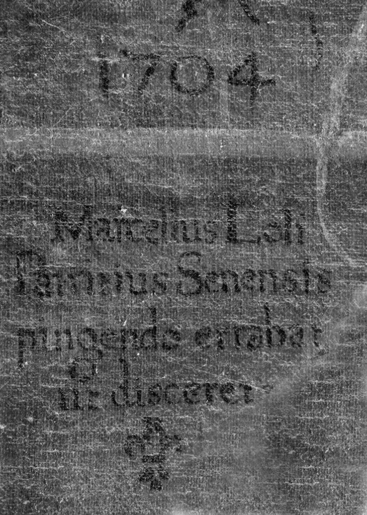 La cornice in legno intagliato, delle stesse dimensioni del dipinto, è applicata sopra la tela. In alto al centro è un riquadro mancante (cm. 85x65) che ospita un dipinto con la Madonna (vedi scheda n. cat. gen. 0900461705). L'opera proviene dalla chiesa di S. Lorenzo nel convento di S. Francesco ad Asciano. | RSTD = 1988 | RSTE = SBAS SI | RSTN = Giacobbe Borelli M. | NSC = Il Brogi ricorda il dipinto senza riportare l'iscrizione con la data e il nome dell'autore. Autore: Loli Piccolomini Marcello di Girolamo; M; 1679; 1743; pittore; scuola senese