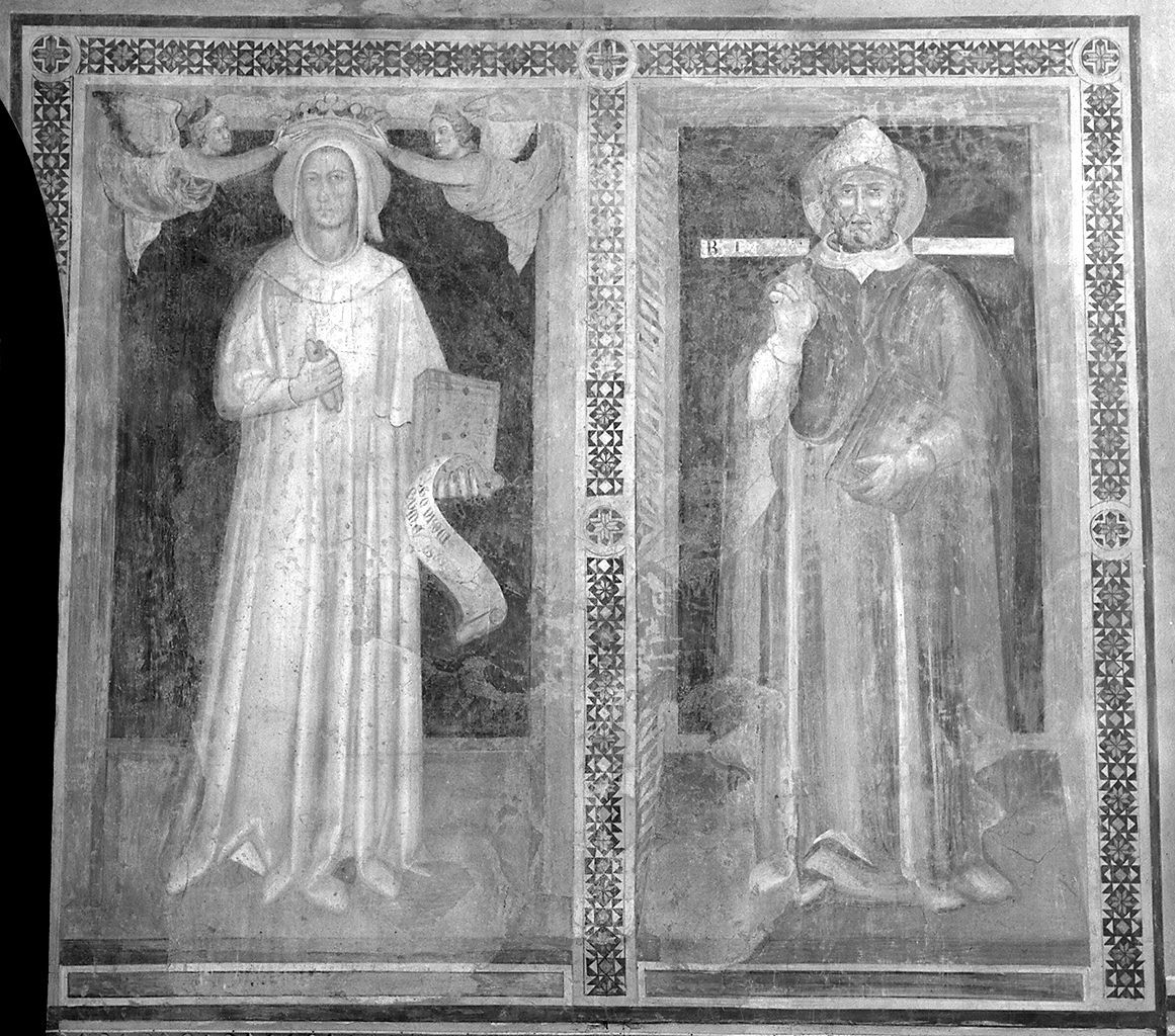 - NOTIZIE STORICO CRITICHE Durante il restauro della chiesa avvenuto fra il 1/2/1937 e il 13/3/1938, come si legge nel dattiloscritto di don A. Brandi "La chiesa di S. Agostino in Montalcino", gli affreschi della navata furono liberati dalla calce seicentesca e restituiti alla luce; i lavori furono seguiti dal pittore Cesare Vagarini. L'affresco non è mai stato L'affresco non è mai stato studiato in modo specifico: sul cartiglio del santo monaco è dipinta una scritta non leggibile