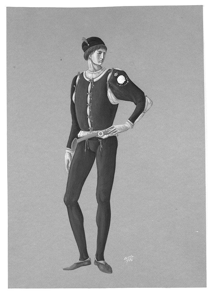 - NOTIZIE STORICO CRITICHE Il bozzetto appartiene a un gruppo di undici relativi alle monture di fatica e commissionati dalla Contrada del Nicchio a Pier Luigi Olla. Tali costumi vennero rinnovati agli inizi degli anni '90. L'artista vive e opera a Siena
