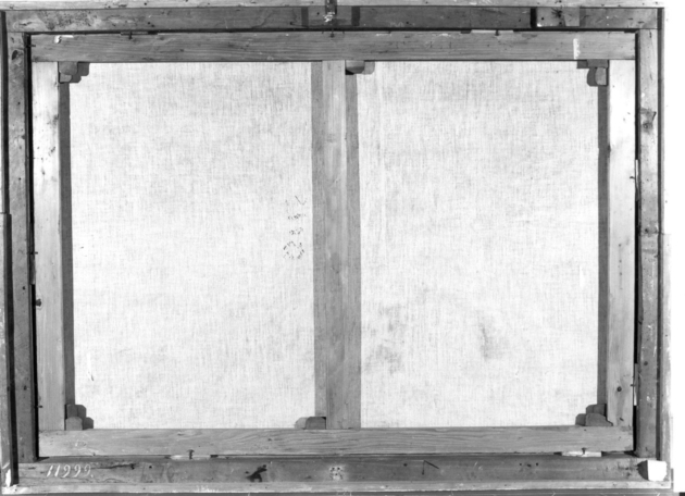 In un paesaggio boscoso, con piccolo villaggio, pastori attingono acqua ad un ruscello e donne lavano panni. Colori: rosacei, azzurrini, lavagna nelle figure; verdi-bruni nel paesaggio. Cornice sagomata liscia e dorata
