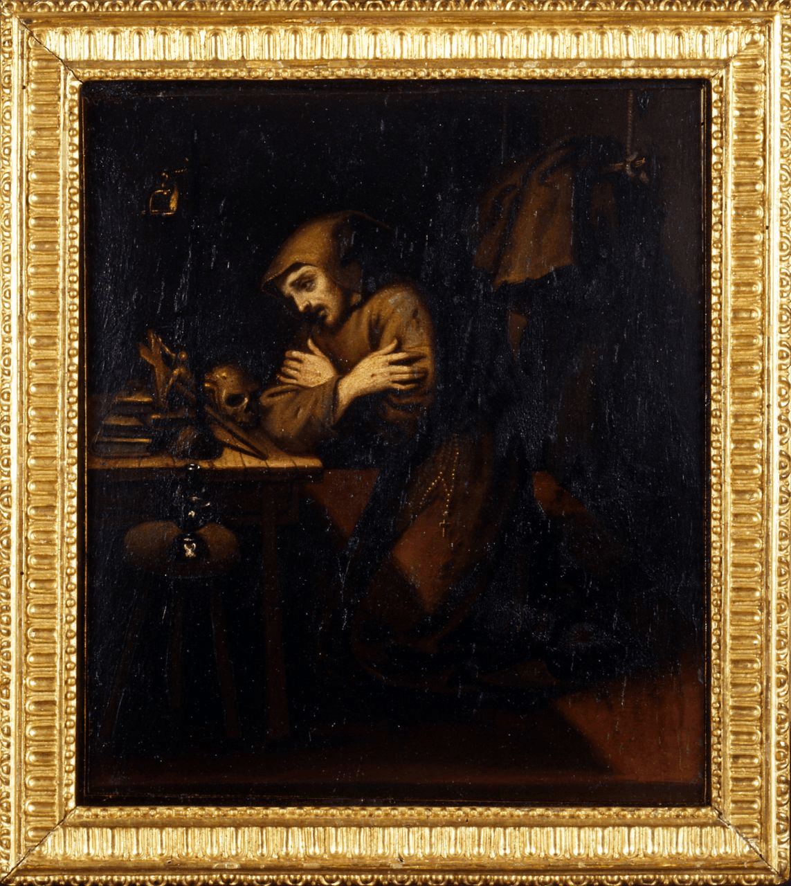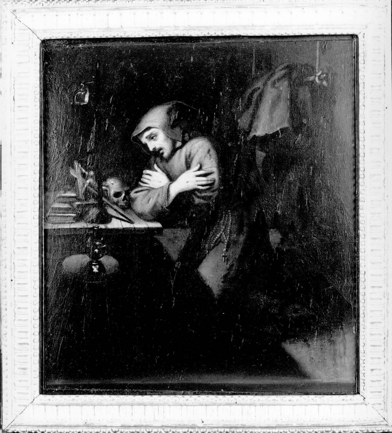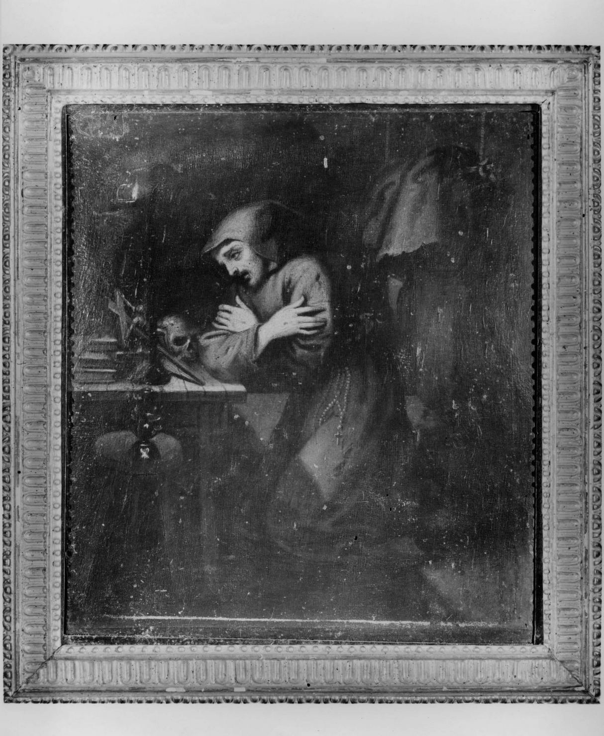 Personaggi: san Francesco d'Assisi. Attributi: (san Francesco d'Assisi) crocifisso; (san Francesco d'Assisi) libro; (san Francesco d'Assisi) teschio; (san Francesco d'Assisi) stimmate. Oggetti: mobilia; tavolo di legno; sgabello; libri; lucerna; vaso