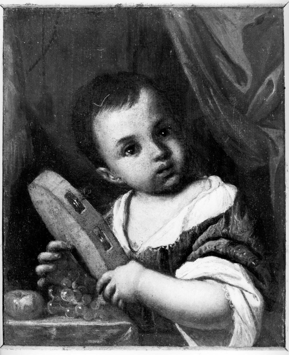Figure: bambina. Strumenti musicali: cembalo. Mobilia: tavolo. Frutti: uva; mela