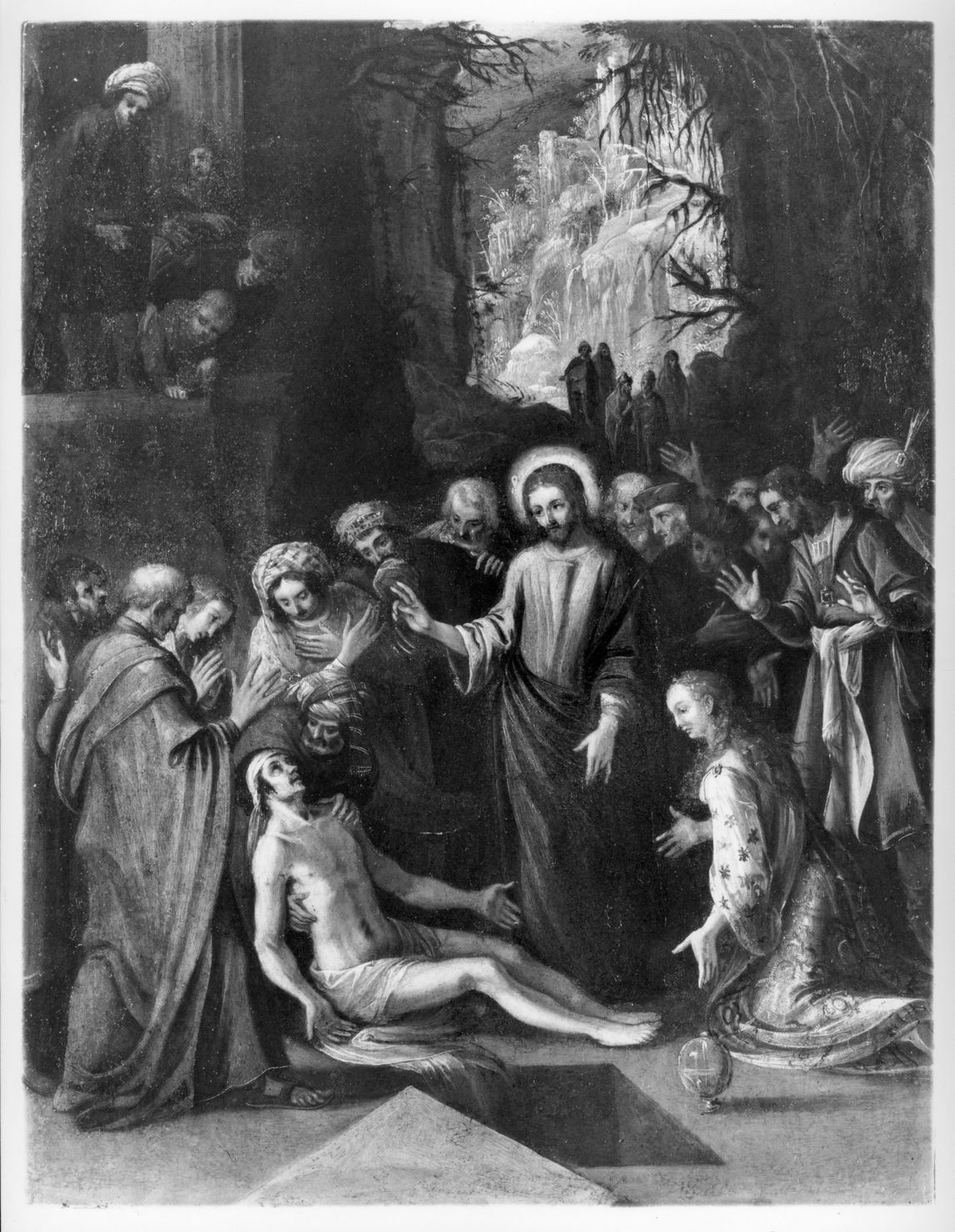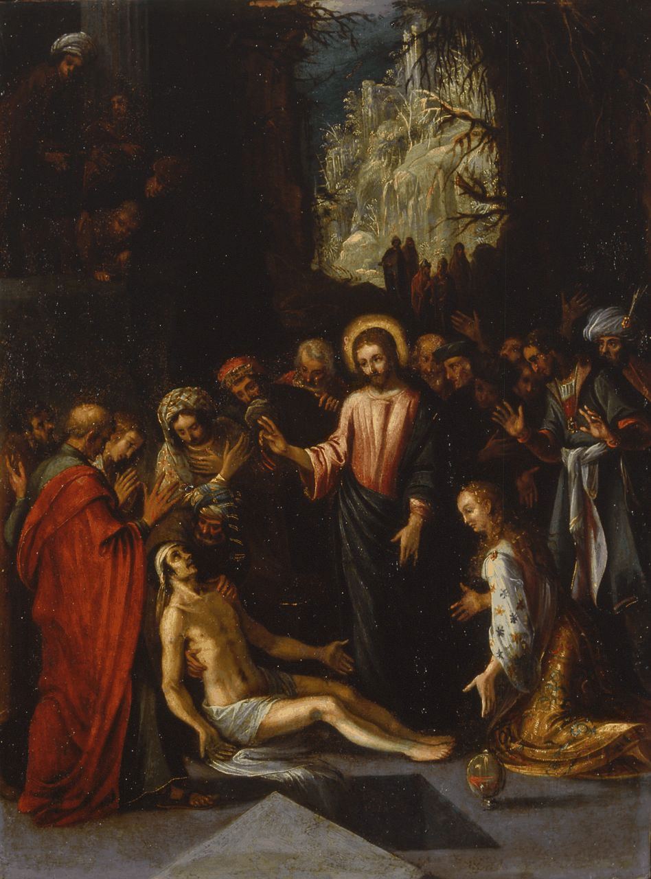 Personaggi: Cristo; Lazzaro; Marta; Maria; apostoli. Paesaggi: caverna; rocce. Piante: alberi; arbusti
