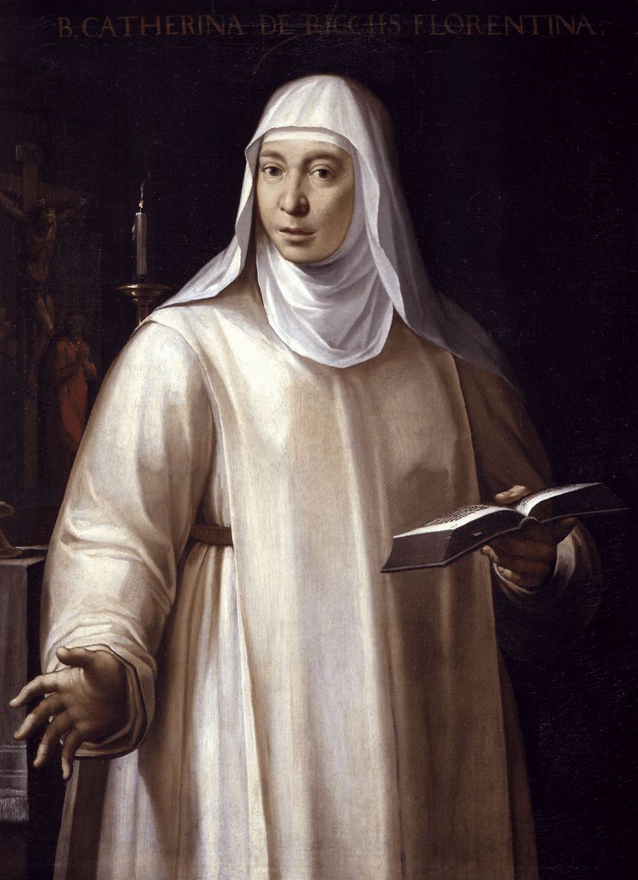 Personaggi: Caterina de' Ricci. Abbigliamento: veste bianca; velo bianco. Oggetti: libro; una candela; dipinto con la Crocifissione