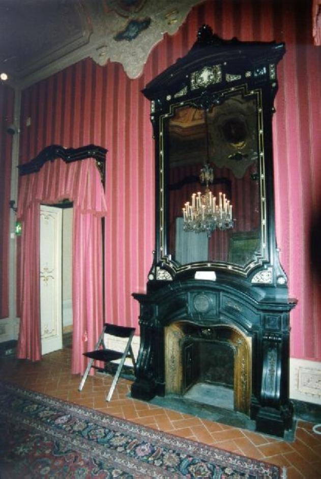 - NOTIZIE STORICO CRITICHE La mostra del camino costituisce una parte dell'apparato architettonico-decorativorealizzato per la cosidetta "sala nera", la saletta da fumo del piano nobiledella Villa Mimbelli. Essa viene completata con una preziosa caminiera in ebanoe avorio, e con i reggitenda che ne riprendono colore e materiali. Alle paretiil tono un poco cupo dell'insieme è compensato dalle preziosa stoffa di setaa righe rosa, mentre sul soffitto si trovano ricche decorazioni a stucco biancoe ocra con inserti dipinti. AUTN: Micheli Vincenzo; AUTA: 1830/ 1895; AUTS: attribuito; AUTR: ideazione; AUTM: bibliografia