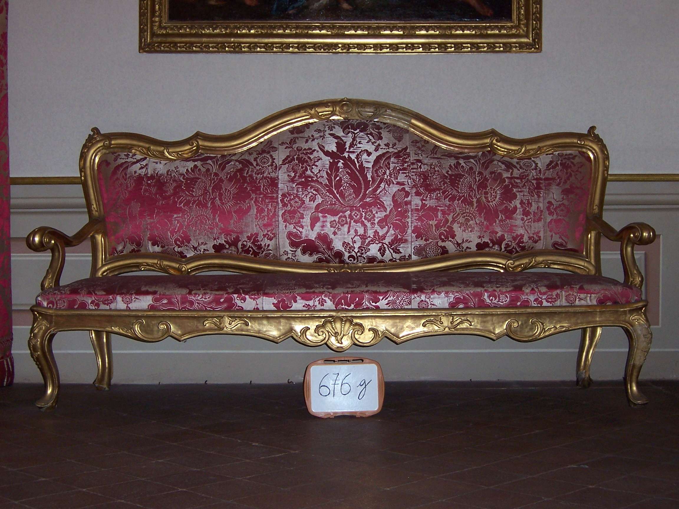 Divano in legno intagliato e dorato, imbottito di damasco rosso e rosa