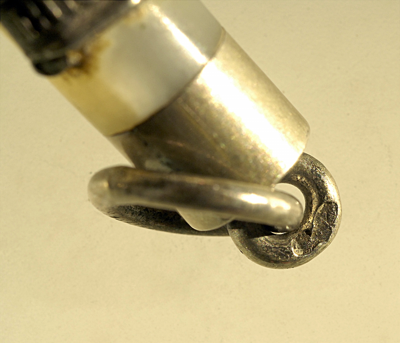 Crocifisso a pendente con anello. I bracci della croce sono a sezione circolare, il corpo del Cristo appeso poggia i piedi su una mensola di sostegno. Cartiglio con iscrizione in alto