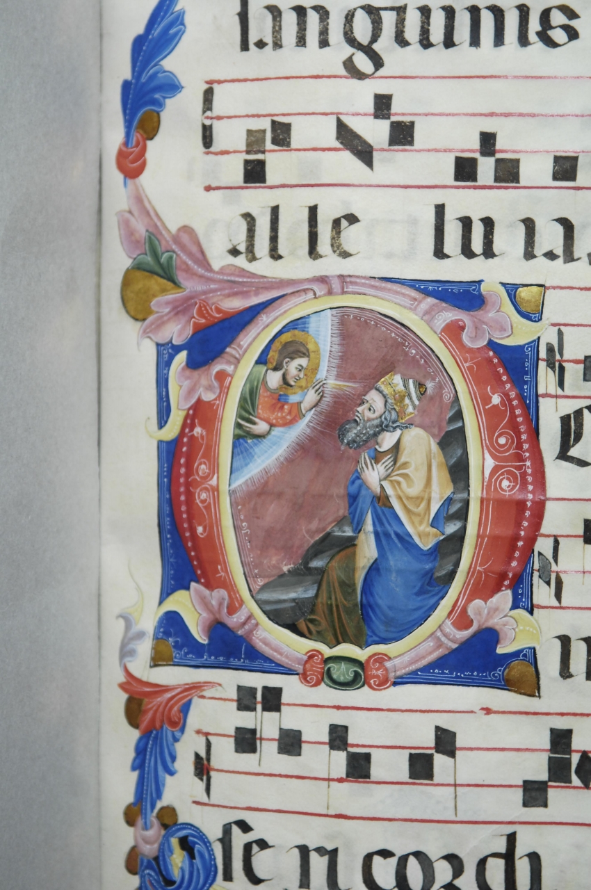 - NOTIZIE STORICO CRITICHE Il codice fa parte del gruppo di corali provenienti dalla chiesa di Santa Maria del Carmine di Firenze che, nella seconda metà dell'Ottocento, in seguito alle soppressioni napoleoniche, entrarono a far parte della collezione del Museo di San Marco. Attribuito a un Ignoto miniatore del secolo XV dal Rondoni (1876 pp. 73-75, n. 56), ma già segnato come proveniente dal Carmine, fu studiato dal D'Ancona (1914, Vol. II, I, pp. 203-205) che non ne individuò il miniatore ma lo ascrisse ad un artista del XV secolo, caratterizzato da uno stile "ritardatario" ma abile in alcune figure nel raggiungere una certa grandiosità, nonostante realizzi spesso figure sproporzionate. Le ultime miniature, invece, di qualità scadente, sarebbero riconducibili ad un discepolo; di particolare pregio sono i fregi decorati con uccelli e animali fantastici. Lo studioso ipotizza che, nel monaco ai piedi della miniatura a c. 1r con la Resurrezione, si possa identificare l'ignoto miniatore che eseguì l'opera. Il Chiarelli (1968(1981), p. 65) attribuisce il codice a Don Simone camaldolese e scuola, uniformandolo così al gruppo degli altri codici provenienti dal Carmine e in gran parte attribuiti al miniatore camaldolese, escludendone la miniatura a c. 31r, attribuita a Giovanni del Biondo, e le tredici iniziali con la figura di re David e una con l'Eterno di mano più incerta. La Scudieri (La Miniatura, in La Chiesa e il Convento di San Marco a Firenze, Firenze 1990, V. II, p. 13) ne esclude l'attribuzione a Don Simone camaldolese e a Giovanni del Biondo per la c. 31r, rimanendo sull'attribuzione a tre anonimi miniatori: il primo, che la studiosa ritiene un tardo seguace di Pacino di Bonaguida, sarebbe autore delle miniature alle cc. 146v, 168r, 171v, 177r, il secondo delle cc. 26r, 31r, 50v, 64r, 78v, caratterizzate da uno stile aulico e dalle forme espanse legate ai modelli pittorici, mentre, nelle restanti carte, sarebbe presente il principale responsabile dell'illustrazione del codice, le cui miniature sono caratterizzate da una maniera espressionistica che si allontana dai canoni fiorentini per avvicinarsi a un gusto nordico al quale riconducono l'impostazione di scene complesse animate da figure contorte e il prolificare di drôlerie e animali fantastici nei fregi. Anche La Ciardi (Codici pisani trecenteschi a Firenze, in La miniatura italiana in età romanica e gotica Atti del I Congresso di Storia della Miniatura Italiana (Cortona, 26 - 28 maggio 1978) a cura di G. Vailati Schoenburg Waldenburg, Firenze 1979, pp. 513 e segg.), infatti, aveva distinto le mani di due miniatori che ipotizza di provenienza pisana