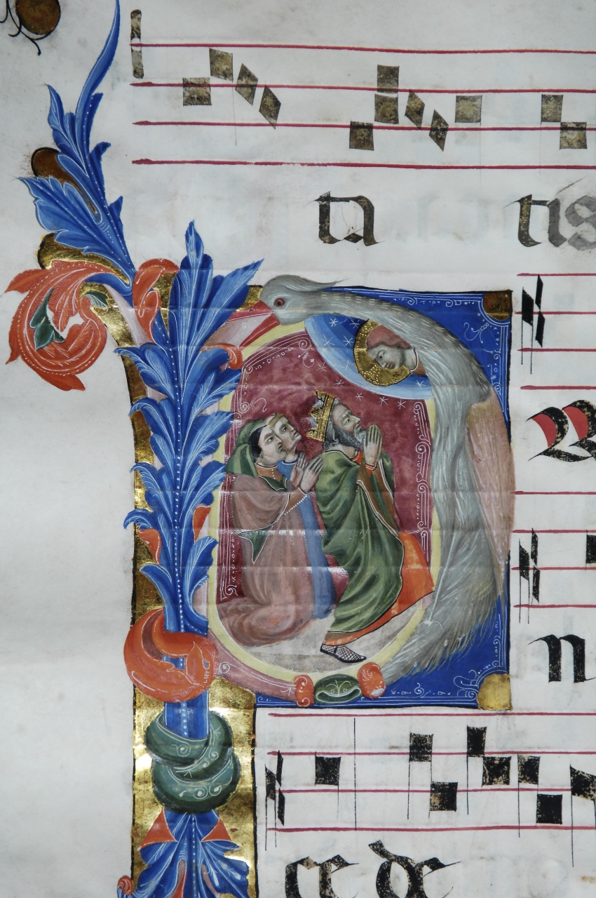 Iniziale figurata media caudata P (Protector noster), rubr. Dominica XIIIIa. Introitus. Capo della lettera in foglia d'oro, corpo formato da foglie azzurre che formano anche la coda e da un uccello verde-grigio e rosa. Sul fondo è il volto di Dio Padre che esce dalla sfera celeste rivolto verso un profeta orante con la corona accompagnato dalle figure di un laico e un frate inginocchiati in preghiera