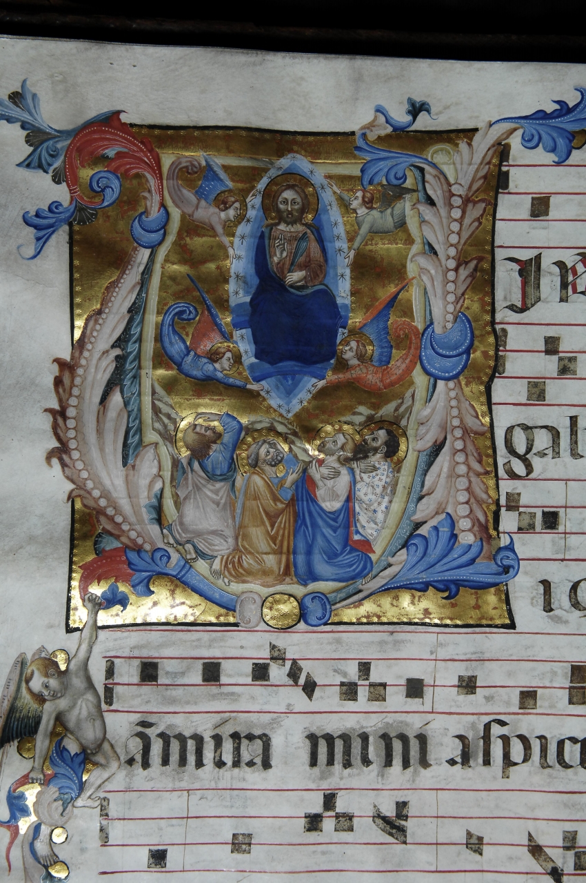 Iniziale istoriata grande caudata V (Viri galilei), rubr. a c. 50r, Introitus. Campo e fondo della lettera in foglia d'oro, corpo verde interamente coperto da foglie lanceolate che vanno a formare il fregio nel quale sono un putto alato e un centauro con un bastone. La scena è ambientata in un paesaggio roccioso; nel registro inferiore sono le figure di quattro apostoli che rivolgono lo sguardo in alto per vedere Cristo benedicente, con la palma del martirio in mano e seduto entro la mandorla, portato in cielo da quattro angeli