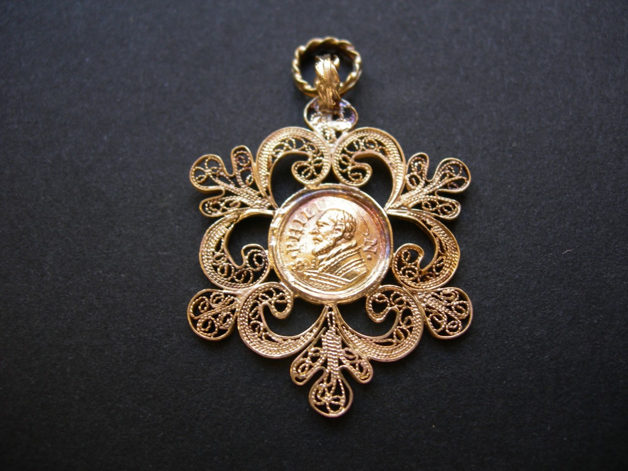 Medaglietta incisa sui due lati entro decorazione a filigrana