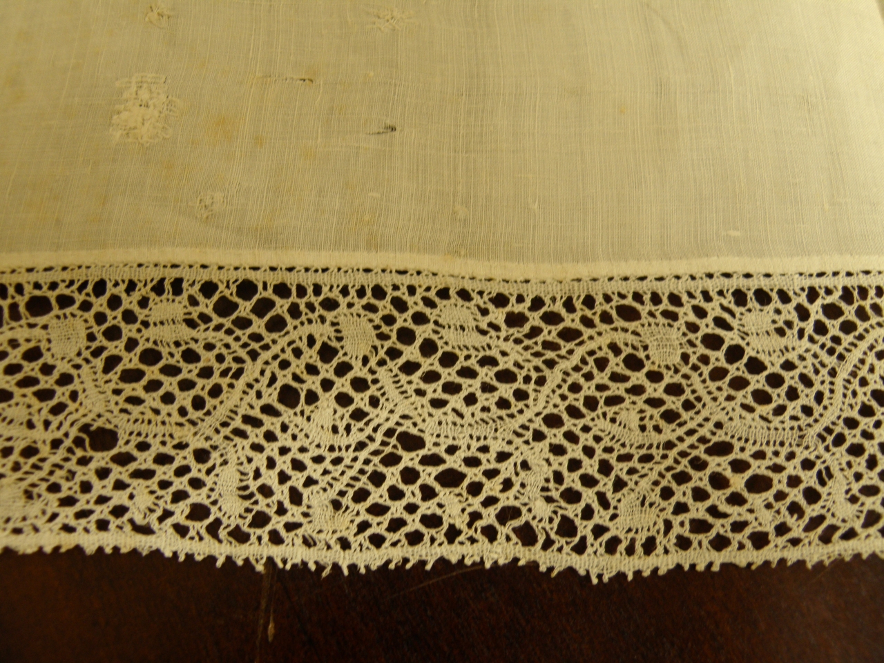 Corporale in lino inamidato, con due croci ricamate a punto croce a filo b ianco e bordato di trina con motivi decorativi realizzati a punto tela su un fondo a cinque buchi