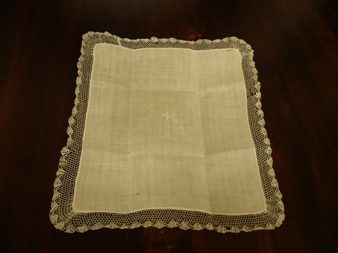Corporale in lino inamidato bordato di trina, con iniziali coronate ricama te a punto croce e croce ricamata al centro a punto passato, entrambe con filo bianco