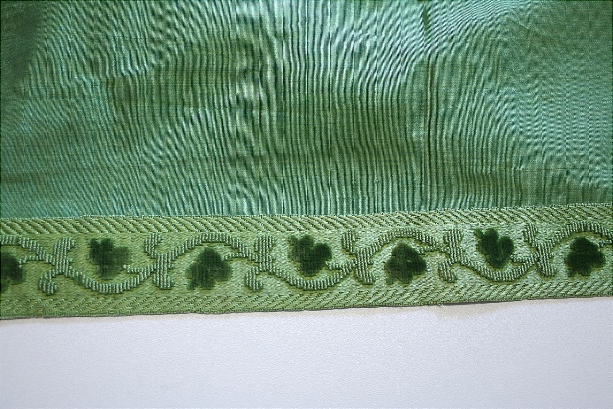 Coperta da letto in tessuto unito di seta moirè, verde. Bordura in tessuto operato fondo raso verde e opera in velluto cesellato verde