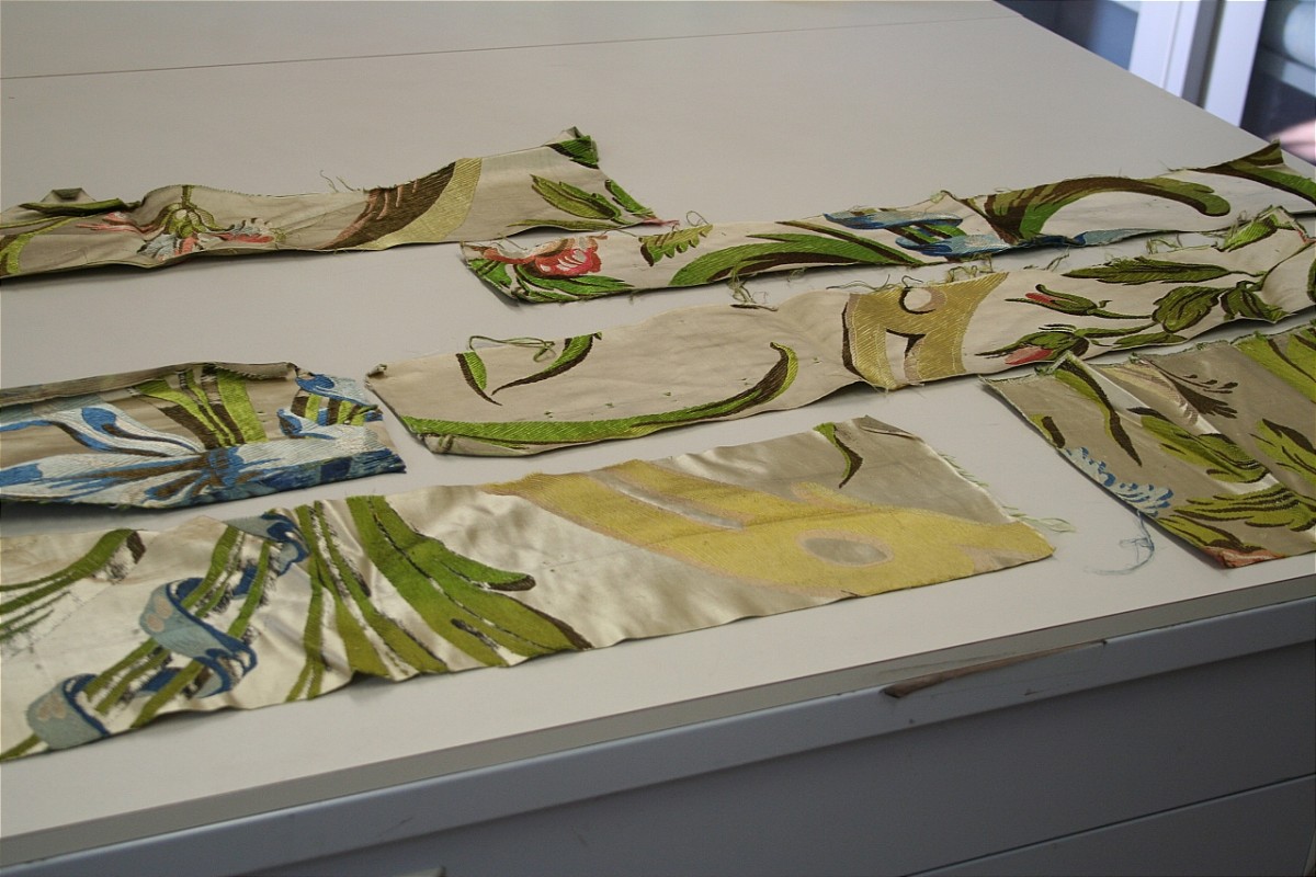 Sei frammenti di tessuto operato in seta con fondo raso avorio e opera policroma