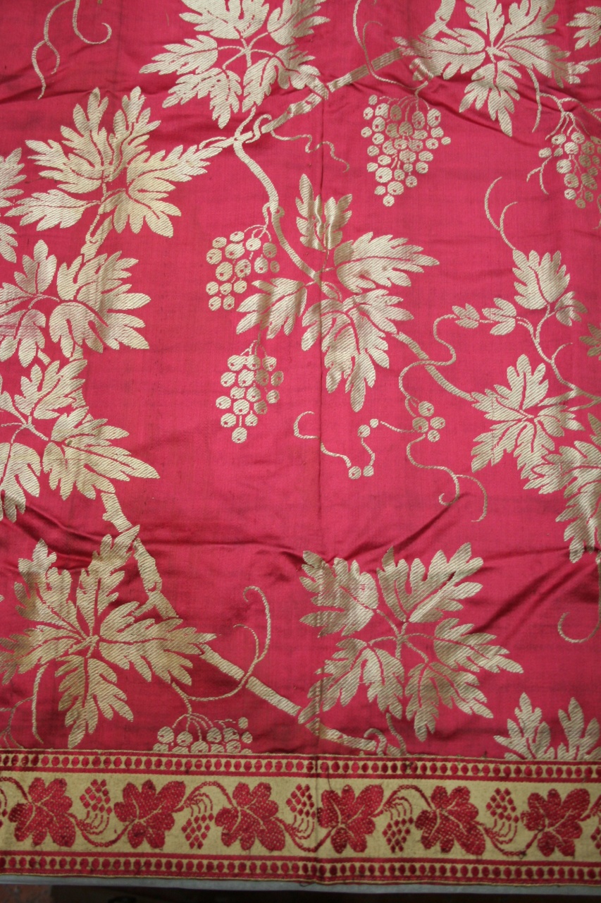 Portiera divisa e sopraporta in tessuto operato di seta, fondo in raso color cremisi, opera a tralci di vite color avorio. Gallone in tessuto operato di seta
