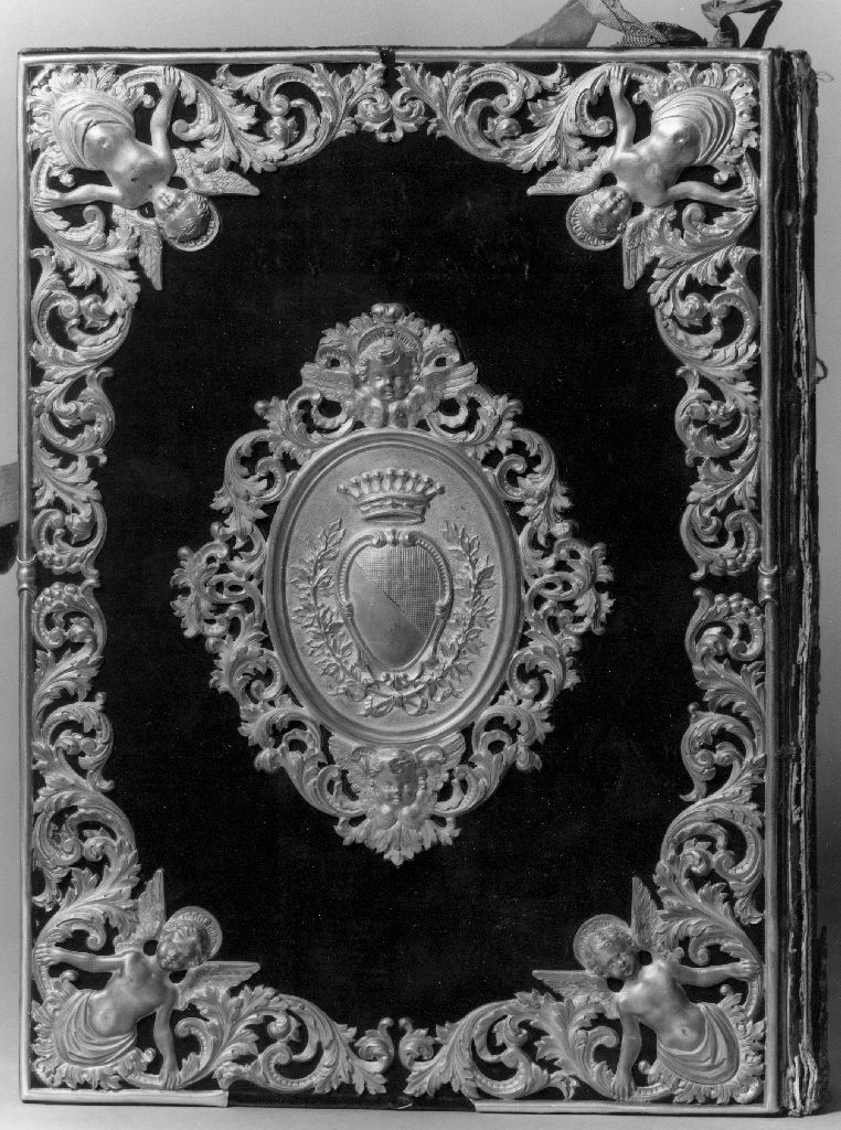 Il recto della coperta è profilato, su un fondo di velluto rosso, all'esterno, da una cornice bombata, che a metà di ogni lato si spezza a contenere un ovulo e, all'interno, da una cornice traforata. Questa è fissata alla coperta e reca, agli angoli, quattro angeli aureolati a mezza figura, con le braccia allargate e vestiti unicamente di un perizoma da cui spunta un cespo di foglie d'acanto. Da ciascun angelo nascono due tralci di volute a rigogliose foglie d'acanto, l'uno più breve e l'altro più lungo, i quali si dispiegano rispettivamente sul lato minore e su quello maggiore e si oppongono speculari. La cornice delimita uno spazio interno ovale libero, nel quale emerge il velluto del fondo. Al centro è fissato un ovale profilato da due coppie di tralci di volute a foglia d'acanto speculari traforate, che s'intrecciano ai vertici del diametro minore. (Segue in OSS)