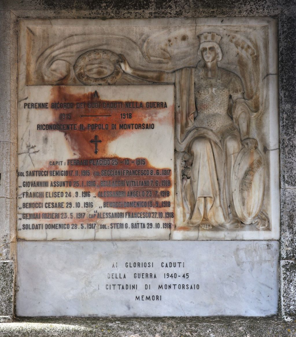 - ISCRIZIONI sulla lastra in marmo accanto al rilievo - A/ PERENNE RICORDO DELLA GUERRA/ 1915 ---- 1918/ RICONOSCENTI IL POPOLO DI MONTORSAIO/ CAPIT. FERRARI PLACIDO 25 - 10 - 1915/ SOL. SANTUCCI REMIGIO 17.11.1915/ SOL. GIOVANNINI ASSUNTO 25.1.1916/ SOL. FRANCHI ELISEO 24.9.1916/ SOL. BENOCCI CESARE 29.10.1916/ SOL. GENNAI RIZIERI 23.5.1917/ SOL. SOLDATI DOMENICO 28.5.1917/ SOL. SECCIANI FRANCESCO 8.6.1917/ SOL. BELLACCHI VITALIANO 7.6.1918/ SOL. ALESSANDRI ANGELO 23.7.1918/ BENOCCI DOMENICO 13.9.1918/ CAP.LE ALESSANDRI FRANCESCO 27.10.1918/ SOL. STERI G. BATTA 29.10.1918 - lettere capitali - a caratteri applicati -