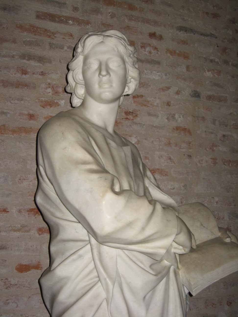 - NOTIZIE STORICO CRITICHE Attualmente collocati nel Museo dell'Opera del Duomo, i quattro evangelisti attribuiti a Cosimo Fancelli facevano parte dell'apparato decorativo che fu apposto alla cappella della SS. Croce nella cattedrale di Lucca nel 1663. Le quattro statue furono donate a tal scopo dal lucchese Paolo Liparelli, ingegnere militare, insieme a 8 putti reggenti i simboli della passione di Cristo. Una proposta in tal senso era stata già fatta nel 1623 dall'ingegnere urbinate Muzio Oddi, il quale aveva proposto di celare i difetti costruttivi della cappella mediante l'inserimento di "angioletti a due a due". come attesta Bartolomeo Beverini sia nel Pellegrino guidato per la città di Lucca sia negli Annales (1669 ca; 1671-86 edizione 1829-32), il Liparelli, artefice di altre importanti donazioni al Volto Santo (Bartolomeo Fioriti, 1754 ca, pp. 342-343) donò nel 1661 gli otto putti, che il Trenta nel 1820 attribuisce a Vincenzo Civitali (Trenta 1820, p.84) e due anni più tardi i 4 evangelisti. Secondo la documentazione di cui disponiamo già nel 1853 si parlava del “negotio delle Statue alla Cappella di Santa Croce” (ACL, RR 28). Rammentiamo che tra i beni privati dell’ingegnere militare Paolo Liparelli, nel 1667 figuravano “n. 7 angioletti di terracotta .. modelli di 7 angeli che sono sopra la cappella di S. Croce” e “una figura di terracotta di S. Matteo coll’angelo modello della statua” (ASL, Guinigi 161, n. 4, carte non numerate), anch’essa da identificarsi con quella donata dal Liparelli per ornare la cappella del Volto Santo (Arte a Lucca 2011, p. 217). Secondo Paolini (ante 1681), i due gruppi furono realizzati a Roma da Cosimo Fancelli su bozzetti di Pietro da Cortona, similmente a quanto afferma il Ms.1547 “Notizie tratte dal manoscritto di casa Cardella”: “Le statue dei quattro Evangelisti con li otto Angeletti che in alto vedansi, attorno alla Cappella , sono opera di Cosimo Fancelli di Roma” (BSL, Ms.1547 “Notizie tratte dal manoscritto di casa Cardella” p.528, fine XVIII). La Belli Barsali ritiene che siano opera di Francesco Fancelli (Belli Barsali 1953, p. 100). Gli otto putti furono collocati sopra il cornicione, mentre i quattro evangelisti furono collocati alle facce trasversali dell'ottagono della cappella, occultando le antiche epigrafi e costringendo a far incidere una nuova targa, ad oggi posta sotto il San Sebastiano. Inizialmente apprezzate dalla critica, a partire dalla seconda metà del Settecento subirono durissime critiche da parte dei cultori del locale neoclassicismo; primo tra essi fu il pittore ducale Stefano Tofanelli (in di Poggio edizione 1939). La rimozione delle 12 statue ebbe luogo nel 1838 grazie al capillare intervento di restauro promosso dal canonico Pietro Pera. Secondo quanto riferisce Ridolfi nel 1882, sembra che i putti finissero sul "tetto di una casa di campagna", qualche anno dopo due di essi erano in possesso di un tale di nome Battaglia e furono esposti durante l'Esposizione di arte e industria antica in Lucca del 1893. le statue degli evangelisti, inizialmente collocate nella cappella della Libertà, dopo lunghe peregrinazioni, finirono nel Museo della cattedrale, che è stato creato nel 1992. L’unica traccia iconografica di cui disponiamo in merito all’aspetto che doveva avere la cappella con le statue del Fancelli si trova nei disegni realizzati in occasione del concorso indetto per la realizzazione della lampada d’oro nel 1836: nei relativi, anonimi progetti, è riportata in dimensioni ridotte l’immagine della cappella con l’annesso apparato scultoreo Le 4 statue si presentano molto ben rifinite nella parte visibile, mentre nella parte retrostante risultano appena abbozzate in quanto erano state concepite fin dall’inizio per una visione puramente frontale. Esse si trovano nel Museo della Cattedrale dal 1992, nella sala degli ornamenti del Volto Santo