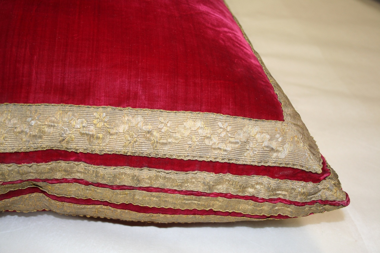 Due cuscini rettangolari in velluto liscio di seta color cremisi con galloni in filo metallico dorato