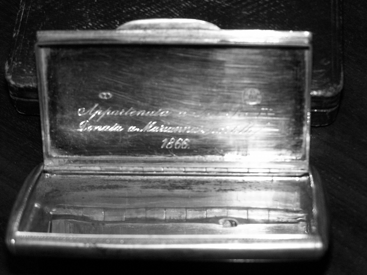 - NOTIZIE STORICO CRITICHE La tabacchiera presenta una particolare rilevanza documentaria perchè fu donata nel 1866, come si evince dall'iscrizione, da Papa Pio IX a Marianna Velluti dei Duchi di San Clemente, consorte di Alessandro Martelli
