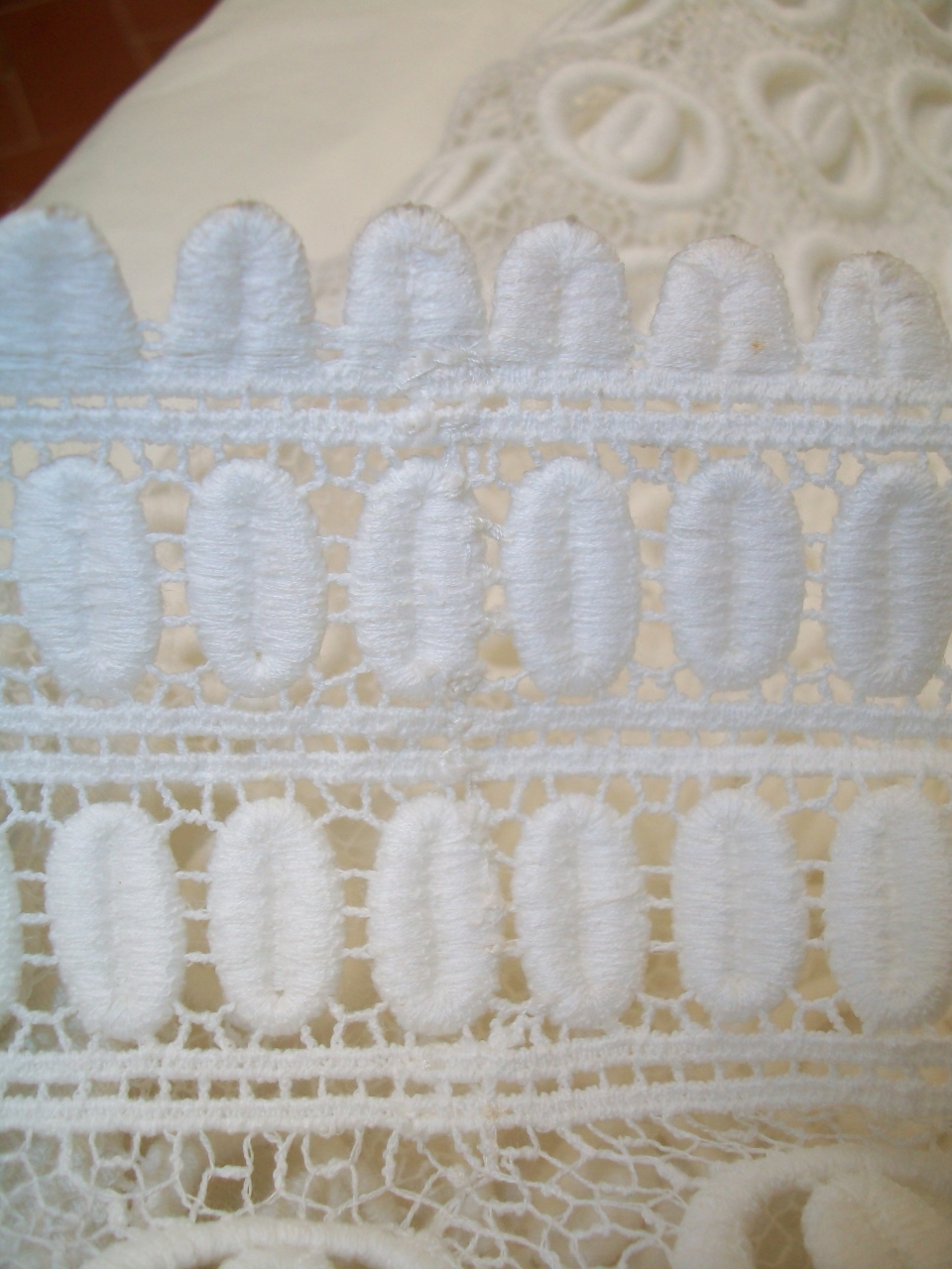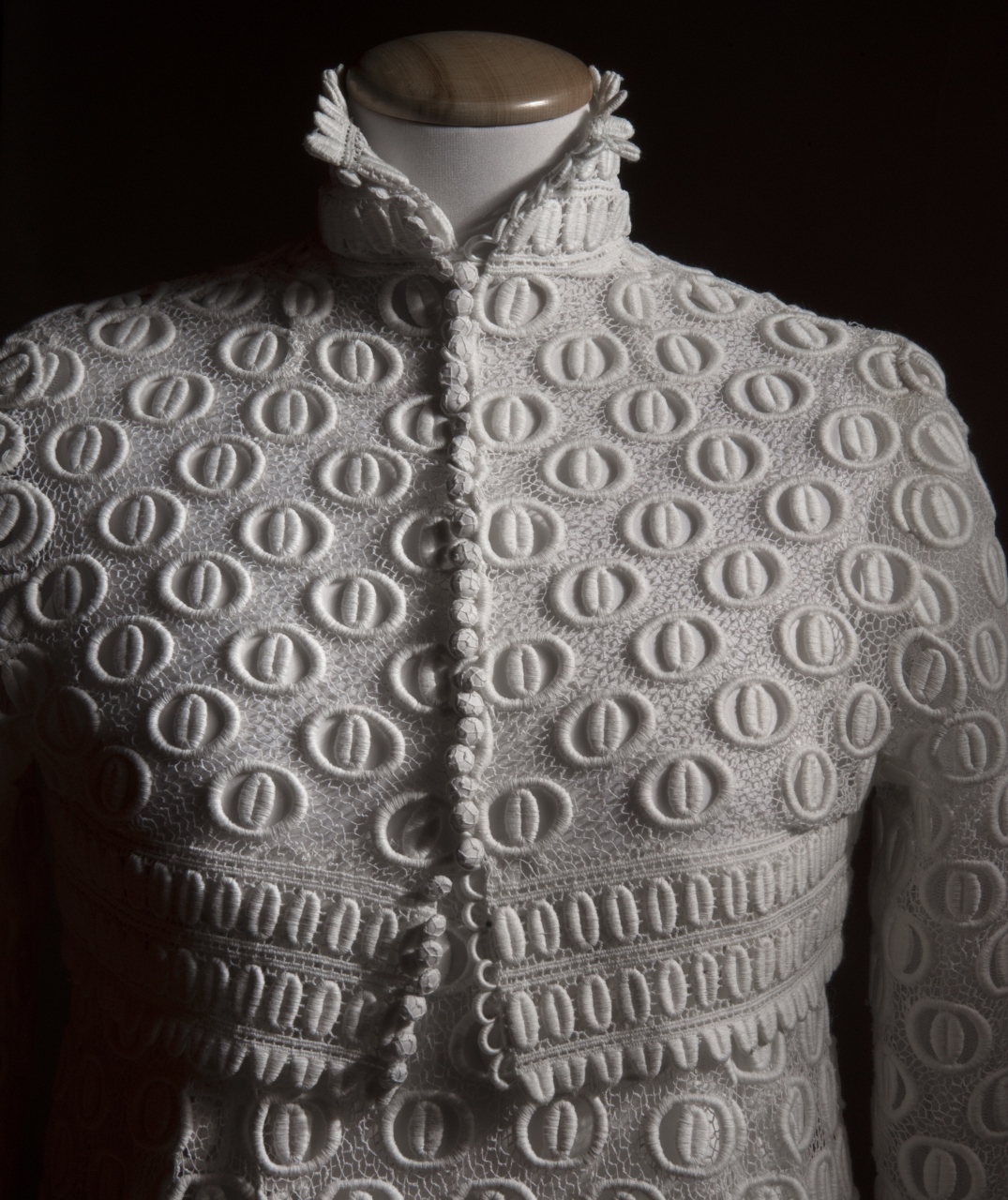 Appartenente ad un completo da sposa costituito anche da un abito e da un cappello con velo. Giacca corta in vita con collo rialzato a cinturino; apertura centrale anteriore con fila di bottoni; maniche lunghe, diritte, in un pezzo, con brevi spacchi ai polsi, chiusi da bottoni. Interamente confezionata in merletto chimico a motivi geometrici, simili ad occhielli con mandorle centrali. Priva di fodera