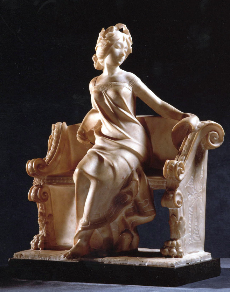 Fanciulla con testa cinta di alloro e seduta su di un divano; opera realizzata in alabastro giallo e firmata T. Cipriani