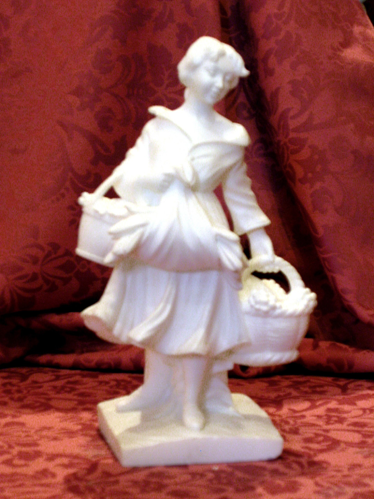 Figura femminile in alabastro bianco con ceste di fiori, frutta e spighe di grano