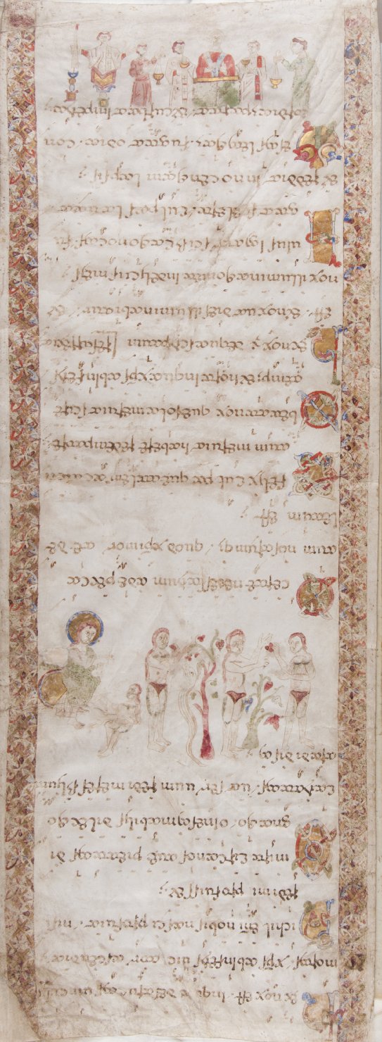 - NOTIZIE STORICO CRITICHE L'exultet è un rotolo in pergamena che veniva svoltato dal diacono dall'ambone nei riti del Sabato Santo durante i quali veniva intonato il canto della Resurrezione e nel contempo acceso il cero pasquale. Le raffigurazioni che illustravano il testo erano dipinte in senso contrario rispetto al cantore che doveva leggere e intonare i canti in modo che potevano essere ben visibili dai fedeli. Generalmente queste proponevano scene dell'Antico e del Nuovo Testamento e i momenti più importanti legati strettamente alla liturgia di Pasqua. Il rotolo qui esaminato scritto in un'ariosa beneventana è ascrivibile sia per il testo che per le miniature ad un area dell'Italia meridionale databile alla prima metà del secolo XI. L'inno dell'exultet è qui trascritto nella sua redazione più ampia e si inserisce in una situazione di confine fra la liturgia beneventana e quella franco romana. La notazione musicale è del tipo beneventano, senza linee né chiave ma con guidone. Difficile è stabilire con esattezza il centro di produzione dell'exultet. La scarsità della gamma dei colori della decorazione e la fattura grafica che lascia molto spazio al disegno di base evidenziandone il contorno e le parti interne delle figure, la struttura delle barre d'incorniciatura dove tralci e foglie stilizzati si mescolano a catene, intrecci nastriforme e nodi serrati di probabile origine islamica, fanno supporre la provenienza dell'Exultet da un monastero benedettino di area campana, mentre i caratteri paleografici della scrittura lo fanno avvicinare ad un'opera proveniente da uno "scriptorium" pugliese fortemente legato alla produzione beneventano-cassinese. L'opera, come suppone la studiosa Calderoni Masetti, per il diffuso utilizzo dell'oro nei motivi decorativi, dovrebbe provenire da un centro molto ricco. Non aveva destinazione conventuale bensì episcopale in quanto nella celebrazione delle autorità religiose non sono citati né abati né prepositi, e la sede a cui era destinato doveva essere arcivescovile. Il centro politico di appartenenza non doveva conoscere la carica dei duces in quanto nella scena dell'Exultet con la Commemorazione dei Duci non compaiono i nomi relativi ai personaggi illustrati. Purtroppo la mancanza dei nomi dell'arcivescovo, del papa e dei due imperatori in questo rotolo, e generalmente presenti in altri exultet, non permette di dare una collocazione topica e cronologica al documento. Il rotolo deve essere arrivato al Duomo di Pisa agli inizi del XII secolo. Alla fine dell'Ottocento l'Opera Primaziale consegnò il rotolo, insieme ad altri oggetti d' arte, in forma di deposito temporaneo al museo Civico di Pisa per garantirne una miglior conservazione e per un maggior abbellimento del Museo stesso. Il rotolo giunse al Museo Civico già diviso in dodici parti. Lo smembramento deve essere avvenuto fra il 1877 (anno in cui è citato dal Forster ancora intatto) e gli anni Novanta. Nel catalogo del museo del 1894 risulta infatti diviso (Supino, pp. 21-22). I vari pezzi di pergamena erano connessi tra loro mediante sovrammissione dei bordi e successivo incollaggio. Il programma illustrativo dell'Exultet si apre con l'Ultima Cena e finisce con la Commemorazione dei Duci. Dopo le prime dodici scene che ricapitolano le vicende cristologiche e che corrispondono ai primi tre frammenti, inizia il testo dell'Exultet vero e proprio le cui righe di scrittura sono continuamente interrotte e anticipate dalle immagini che si riferiscono al brano successivo. Nel dodicesimo frammento compare solo il testo che contiene la dossologia conclusiva
