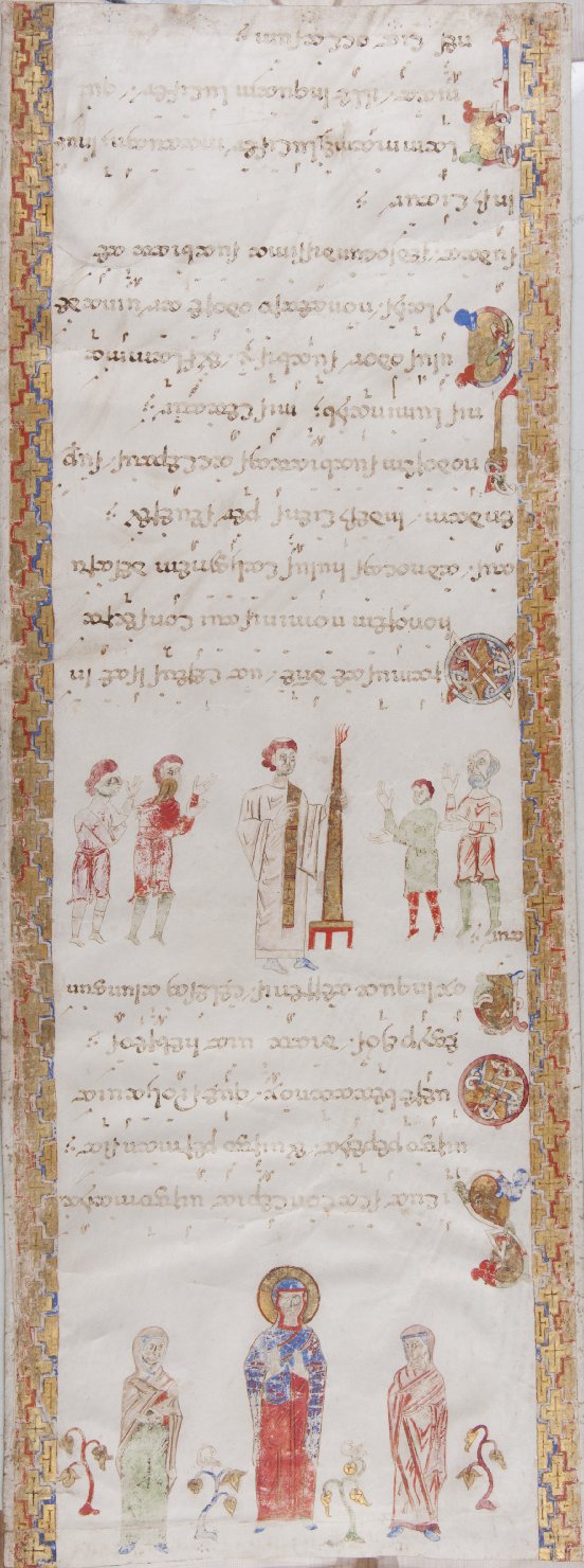 - NOTIZIE STORICO CRITICHE L'exultet è un rotolo in pergamena che veniva svoltato dal diacono dall'am bone nei riti del Sabato Santo durante i quali veniva intonato il canto de lla Resurrezione e nel contempo acceso il cero pasquale. Le raffigurazion i che illustravano il testo erano dipinte in senso contrario rispetto al c antore che doveva leggere e intonare i canti in modo che potevano essere b en visibili dai fedeli. Generalmente queste proponevano scene dell'Antico e del Nuovo Testamento e i momenti più importanti legati strettamente alla liturgia di Pasqua. Il rotolo qui esaminato scritto in un'ariosa benevent ana è ascrivibile sia per il testo che per le miniature ad un area dell'It alia meridionale databile alla prima metà del secolo XI. L'inno dell'exult et è qui trascritto nella sua redazione più ampia e si inserisce in una si tuazione di confine fra la liturgia beneventana e quella franco romana. La notazione musicale è del tipo beneventano, senza linee né chiave ma con g uidone. Difficile è stabilire con esattezza il centro di produzione dell'e xultet. La scarsità della gamma dei colori della decorazione e la fattura grafica che lascia molto spazio al disegno di base evidenziandone il conto rno e le parti interne delle figure, la struttura delle barre d'incornicia tura dove tralci e foglie stilizzati si mescolano a catene, intrecci nastr iforme e nodi serrati di probabile origine islamica, fanno supporre la pro venienza dell'Exultet da un monastero benedettino di area campana, mentre i caratteri paleografici della scrittura lo fanno avvicinare ad un'opera proveniente da uno "scriptorium" pugliese fortemente legato alla produzion e beneventano-cassinese. L'opera, come suppone la studiosa Calderoni Maset ti, per il diffuso utilizzo dell'oro nei motivi decorativi, dovrebbe prove nire da un centro molto ricco. Non aveva destinazione conventuale bensì e piscopale in quanto nella celebrazione delle autorità religiose non sono c itati né abati né prepositi, e la sede a cui era destinato doveva essere arcivescovile. Il centro politico di appartenenza non doveva conoscere la carica dei duces in quanto nella scena dell'Exultet con la Commemorazione dei Duci non compaiono i nomi relativi ai personaggi illustrati. Purtroppo la mancanza dei nomi dell'arcivescovo, del papa e dei due imperatori in q uesto rotolo, e generalmente presenti in altri exultet, non permette di da re una collocazione topica e cronologica al documento. Il rotolo deve ess ere arrivato al Duomo di Pisa agli inizi del XII secolo. Alla fine dell'Ot tocento l'Opera Primaziale consegnò il rotolo, insieme ad altri oggetti d' arte, in forma di deposito temporaneo al museo Civico di Pisa per garantir ne una miglior conservazione e per un maggior abbellimento del Museo stess o. Il rotolo giunse al Museo Civico già diviso in dodici parti. Lo smembra mento deve essere avvenuto fra il 1877 (anno in cui è citato dal Forster a ncora intatto) e gli anni Novanta. Nel catalogo del museo del 1894 risulta infatti diviso (Supino, pp. 21-22). I vari pezzi di pergamena erano conne ssi tra loro mediante sovrammissione dei bordi e successivo incollaggio. Il programma illustrativo dell'Exultet si apre con l'Ultima Cena e finisce con la Commemorazione dei Duci. Dopo le prime dodici scene che ricapitola no le vicende cristologiche e che corrispondono ai primi tre frammenti, in izia il testo dell'Exultet vero e proprio le cui righe di scrittura sono c ontinuamente interrotte e anticipate dalle immagini che si riferiscono al brano successivo. Nel dodicesimo frammento compare solo il testo che conti ene la dossologia conclusiva