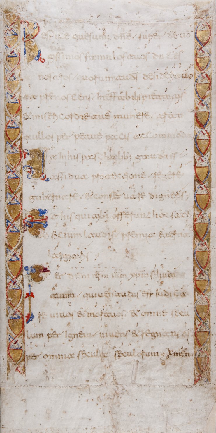 Lungo l'Exultet vi sono 47 lettere decorate che evidenziano i capoversi. Queste sono disegnate con inchiostro nero e colorate con inchiostro rosso, azzurro, verde, giallo, celeste e marrone. Lo sfondo di ognuna è coperto da una sottile lamina d'oro. La tipologia delle lettere è nastriforme costruite da fettucce sottili con terminali fogliati o zoomorfi. Le lettere O hanno nodi sia interni che periferici. Solo la lettera iniziale I della parola Invisibilem (frammento sesto) è costituita da un'aquila eretta