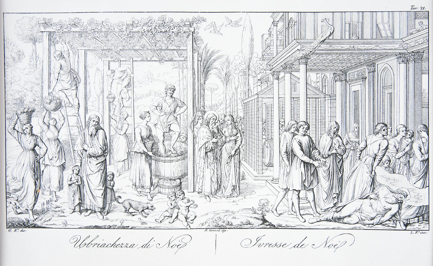 Personaggi: Noè; Sem; Jafet. Figure maschili. Figure femminili. Vegetali: vigna; alberi. Animali: pavone; uccelli; cani