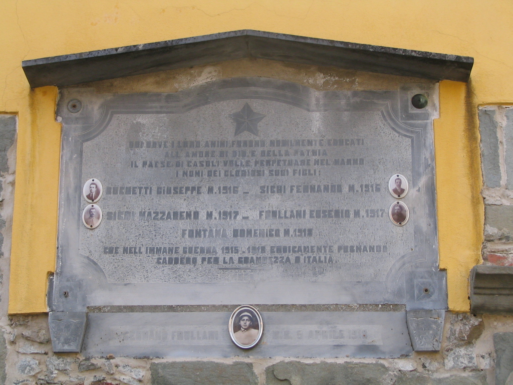 - NOTIZIE STORICO CRITICHE La lapide è collocata sulla facciata di una cappella di recente ristrutturata. Subito sotto ad essa è stata aggiunta una striscia marmorea con nome e fotoceramica di un altro caduto della prima guerra mondiale. Quest'aggiunta deve essere avvenuta molto probabilmente dopo la prima inaugurazione e dev'essere derivata verosimilmente dal fatto che la morte del soldato in questione sia avvenuta con un certo ritardo rispetto agli altri