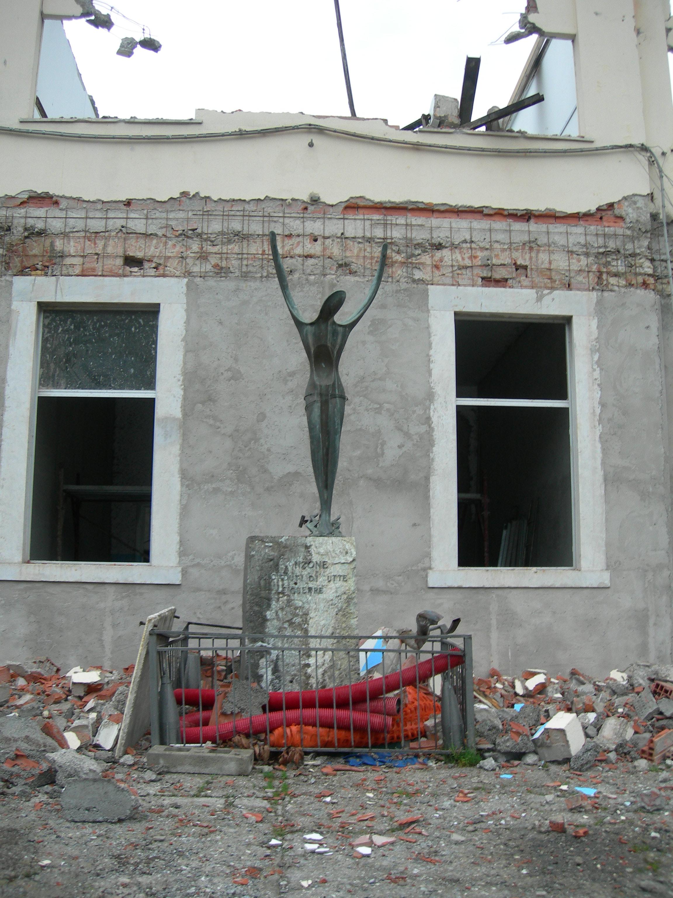 Monumento in singolo elevato, innalzato su area pubblica di pertinenza scolastica, posto al centro di resede quadrato recintato con bassa ringhiera metallica in scatolato commerciale (installata in epoca successiva all’erezione del monumento), in cui ai quattro angoli interni sono sistemati quattro proietti da cannone disarmati; il basamento in pietra (forse un tipo di marmo) è un prisma irregolare, sul cui fronte sono affisse le lettere metalliche singole che costituiscono, poi, la epigrafe, sopra ad esso, in posizione disassata (a Dx del fronte visuale principale) è collocata la statua in bronzo (forse) di tipo modernista/futurista, rappresentante una figura antropomorfa crocifissa poggiante su piedistallo con saette (forse fiamme stilizzate, con, anche, un’improbabile cilindro portabandiera), e cinta ai fianchi con due giri di filo spinato: sul fronte del piedistallo è iscritta la firma dello scultore