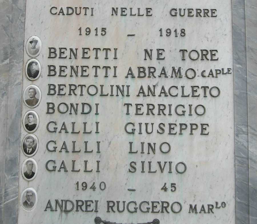 - ISCRIZIONI al centro - CADUTI NELLE GUERRE/ 1915 - 1918/ BENEDETTI NE[S]TORE/ BENEDETTI ABRAMO CAP.LE/ BERTOLINI ANACLETO/ BONDI TERRIGIO/ GALLI GIUSEPPE/ GALLI LINO/ GALLI SILVIO/ 1940 - 45/ ANDREI RUGGERO MAR.LO - capitale - a caratteri applicati in bronzo - italiano