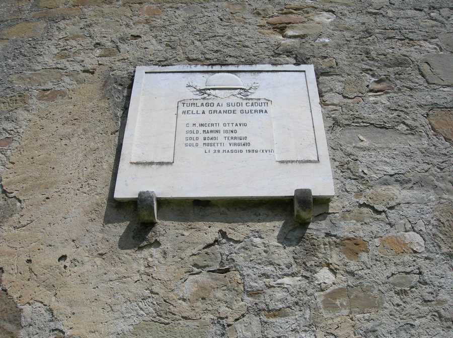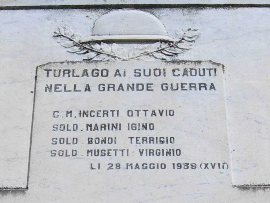 - ISCRIZIONI al centro - TURLAGO AI SUOI CADUTI/ NELLA GRANDE GUERRA/ C. M. INCERTI OTTAVIO/ SOLD. MARINI IGINO/ SOLD. BONDI TERRIGIO/ SOLD. MUSETTI VIRGINIO/ LI 28 MAGGIO 1939 (XVII) - capitale - a incisione - italiano