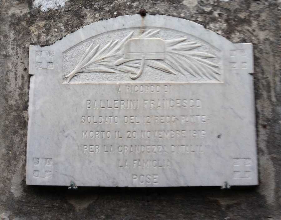 - ISCRIZIONI al centro - A RICORDO DI/ BALLERINI FRANCESCO/ SOLDATO DEL 12° REGG° FANTE/ MORTO IL 20 NOVEMBRE 1916/ PER LA GRANDEZZA D’ITALIA/ LA FAMIGLIA/ POSE - capitale -