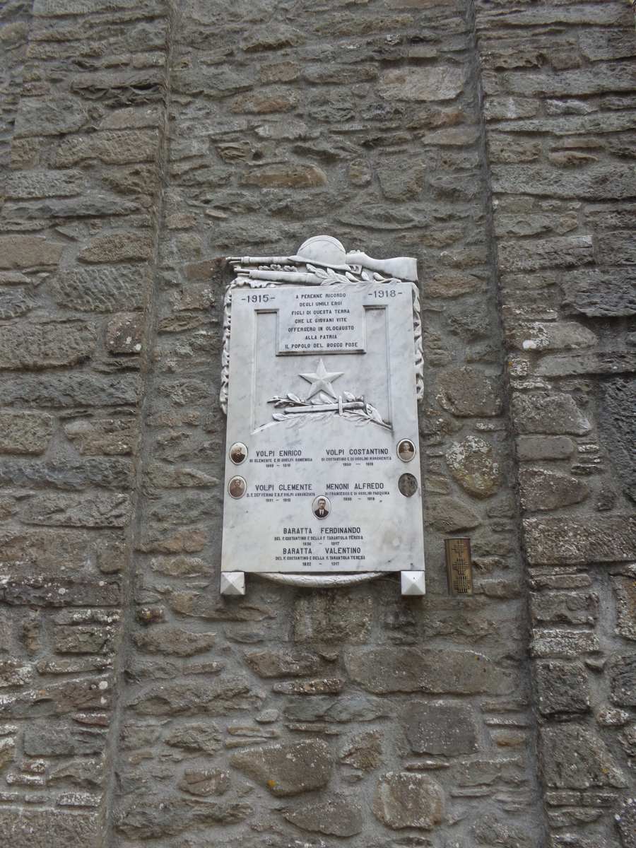 - ISCRIZIONI al centro - 1915 – 1918/ A PERENNE RICORDO/ DEGLI UMILI EROI/ FIGLI DI QUESTA TERRA/ CHE LE GIOVANI VITE/ OFFERSERO IN OLOCAUSTO/ ALLA PATRIA/ IL POPOLO DEL BOSCO POSE/ VOLPI ENRICO/ DI CLEMENTE E DI GHELFI DOMENICA/ 1889 – 1915/ VOLPI CLEMENTE/ D. F. ZEFFERINO E D. F. VOLPI ANNUNZIATA/ 1891 – 1915/ VOLPI COSTANTINO/ DI COSTANTINO E DI UGOLINI MARGHERITA/ 1899 – 1918/ MENONI ALFREDO/ DI FRANCESCO E DI UGOLINI PASQUINA/ 1899 – 1918/ BARATTA FERDINANDO/ DEL F. COSTANTINO E DELLA F. TARANTOLA TERESA/ 1896 – 1917/ BARATTA VALENTINO DEL. F. COSTANTINO E DELLA F. TARANTOLA TERESA/ 1892 – 1917 - capitale -