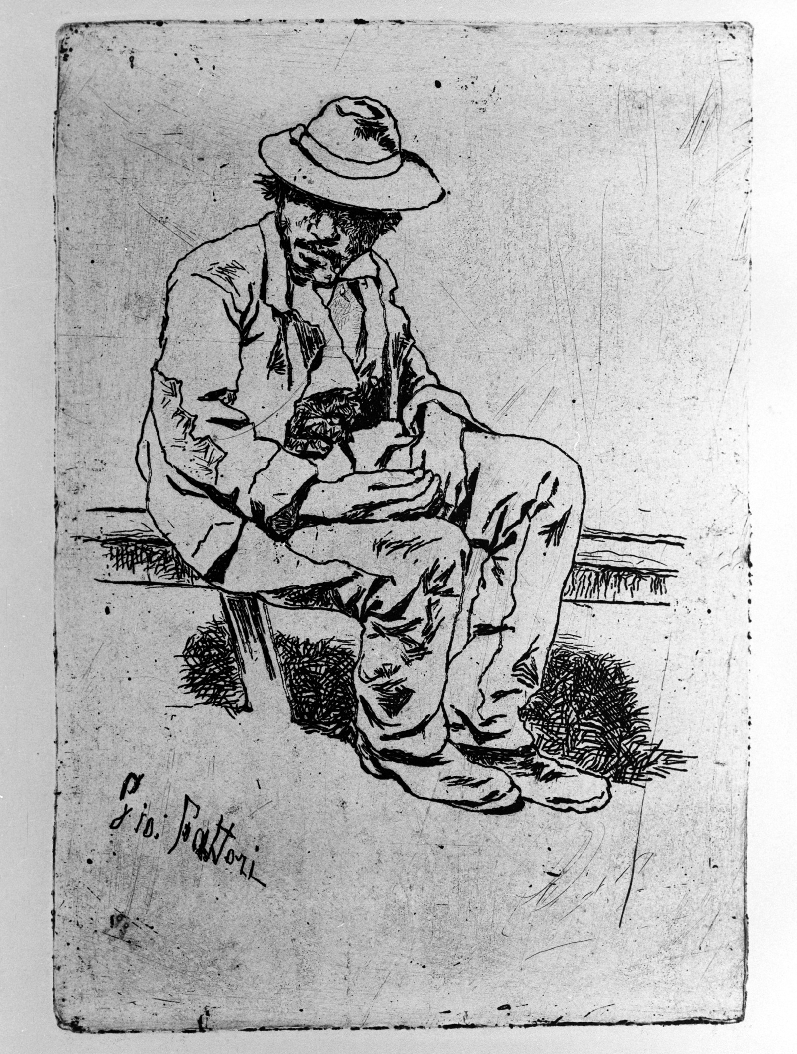 - NOTIZIE STORICO CRITICHE L'acquaforte replica esattamente, in controparte, "Buttero" (Baboni 1983, fig. 48), disegno preparatorio dei dipinti col medesimo tema realizzati dal Fattori tra il 1887 e il 1893. Inoltre, presenta numerose affinità con i disegni preparatori del dipinto "Campagna romana" (Malesci n. 647), databili intorno al 1896. Si tratta di un'immagine fortemente incisiva ed essenziale, costruita con un segno netto e profondo, che delinea i contorni della figura. La datazione dell’esemplare del Museo della Grafica è molto difficile da stabilire, in quanto Fattori nel corso della sua vita non eseguì mai delle tirature sistematiche. Solo nel 1925, in occasione del centenario dalla nascita dell’artista, fu eseguita una ristampa di tutte le acqueforti (a cura dell'editore fiorentino Primo Benaglia), in esemplari numerati e timbrati. A seguito di questa ristampa le matrici furono donate da Giovanni Malesci, erede del Fattori, al Gabinetto Disegni e Stampe degli Uffizi. Un’altra ristampa fu eseguita nel 1958 in occasione di una mostra tenutasi a Roma presso la Calcografia Nazionale. Pertanto, vista l’assenza di timbri o numerazioni relativi alle due ristampe sopracitate, è possibile ipotizzare che la stampa presa in esame corrisponda a una tiratura postuma, realizzata entro il 1925