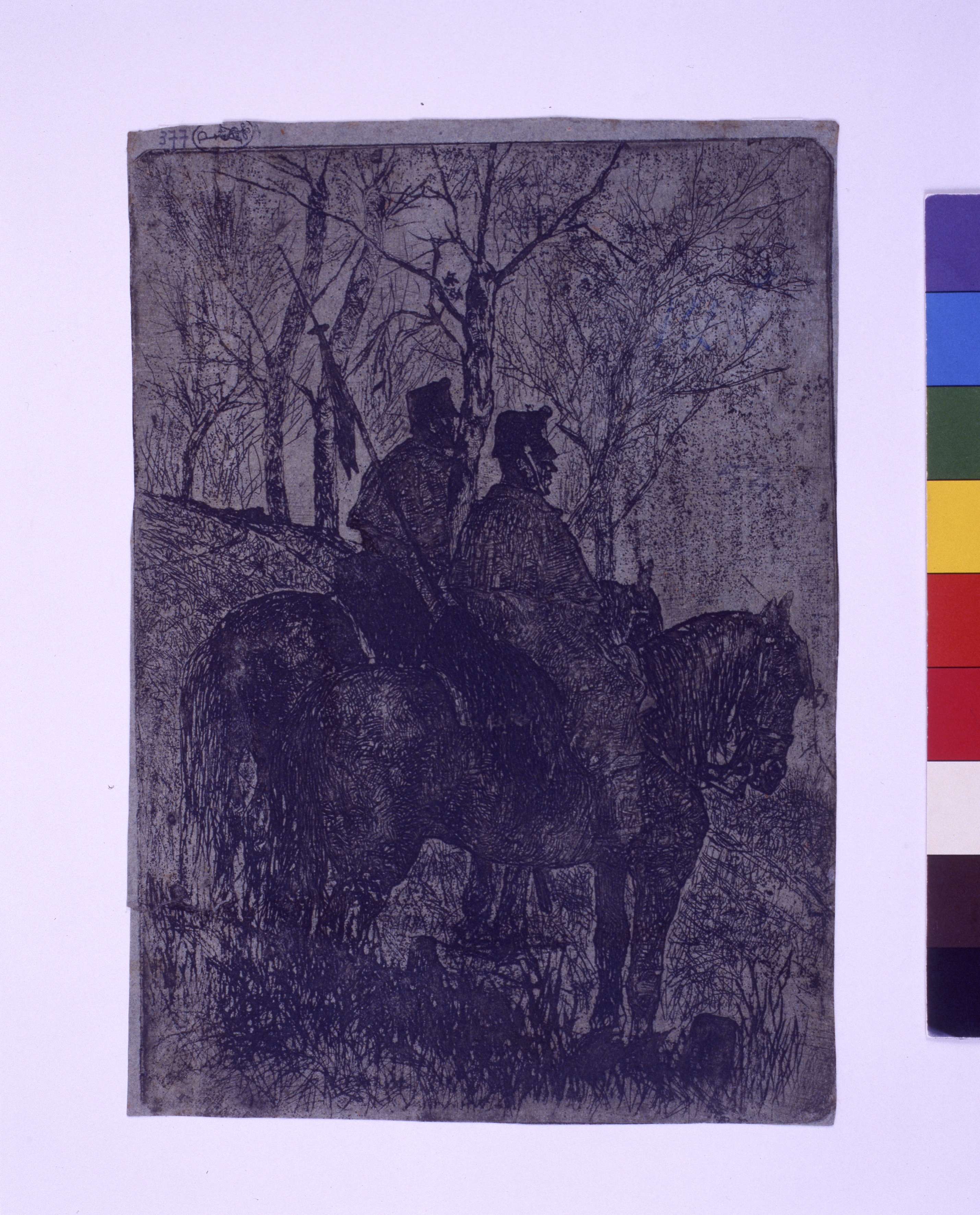 - NOTIZIE STORICO CRITICHE L'acquaforte, appartenente al ciclo dei soggetti militari, è collocata dalla critica alla fine degli anni Novanta (Bonagura 1987), per la costruzione delle figure in controluce e per l'utilizzo di un fitto intreccio di segni, tipico delle opere di questo periodo. Il foglio del Museo della Grafica è una tiratura di prova, impressa direttamente da Fattori, come si può facilmente osservare dai difetti presenti nell’inchiostratura e nell’impressione, dovuti al piccolo torchio da lui usato. Sul verso è presente la scritta a matita "vedetta di artiglieria", e più sotto a lapis viola "143". La collezione Timpanaro possiede anche un altro esemplare tirato dalla medesima lastra (inv. 2827), di tiratura probabilmente postuma