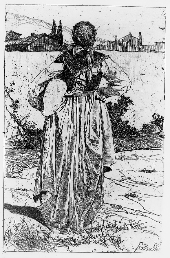 - NOTIZIE STORICO CRITICHE La lastra di questa acquaforte fu eseguita in un periodo antecedente al 1888, in quanto un esemplare fu acquistato, insieme ad altre 20 incisioni, dalla Galleria Nazionale d'Arte Moderna di Roma il 3 settembre dello stesso anno. La figura della gabbrigiana vista di spalle, figura ricorrente nella produzione fattoriana, è una ripresa dal dipinto Macchiaiole (Malesci 1961, n. 636) del 1966, da cui derivano anche altri dipinti e incisioni, tra cui Le gabbrigiane (inv. 2837). Tuttavia, questa acquaforte rappresenta una delle migliori versioni di tale soggetto, costruito con un segno maturo che dà grande monumentalità alla figura. L'esemplare della collezione Timpanaro presenta come supporto una carta spessa su cui è applicata carta Cina, del tutto simile alle incisioni acquistate nel 1908 dall'esecutore testamentario dell'artista, Giovanni Malesci; si può dunque ipotizzare che esso appartenga alla medesima tiratura. Il museo possiede, inoltre, un altro esemplare della medesima lastra (inv. 2841) di tiratura probabilmente postuma. La stampa è nota alla critica anche con i titoli: Boscaiola toscana; Gabbrigiana; Costume livornese