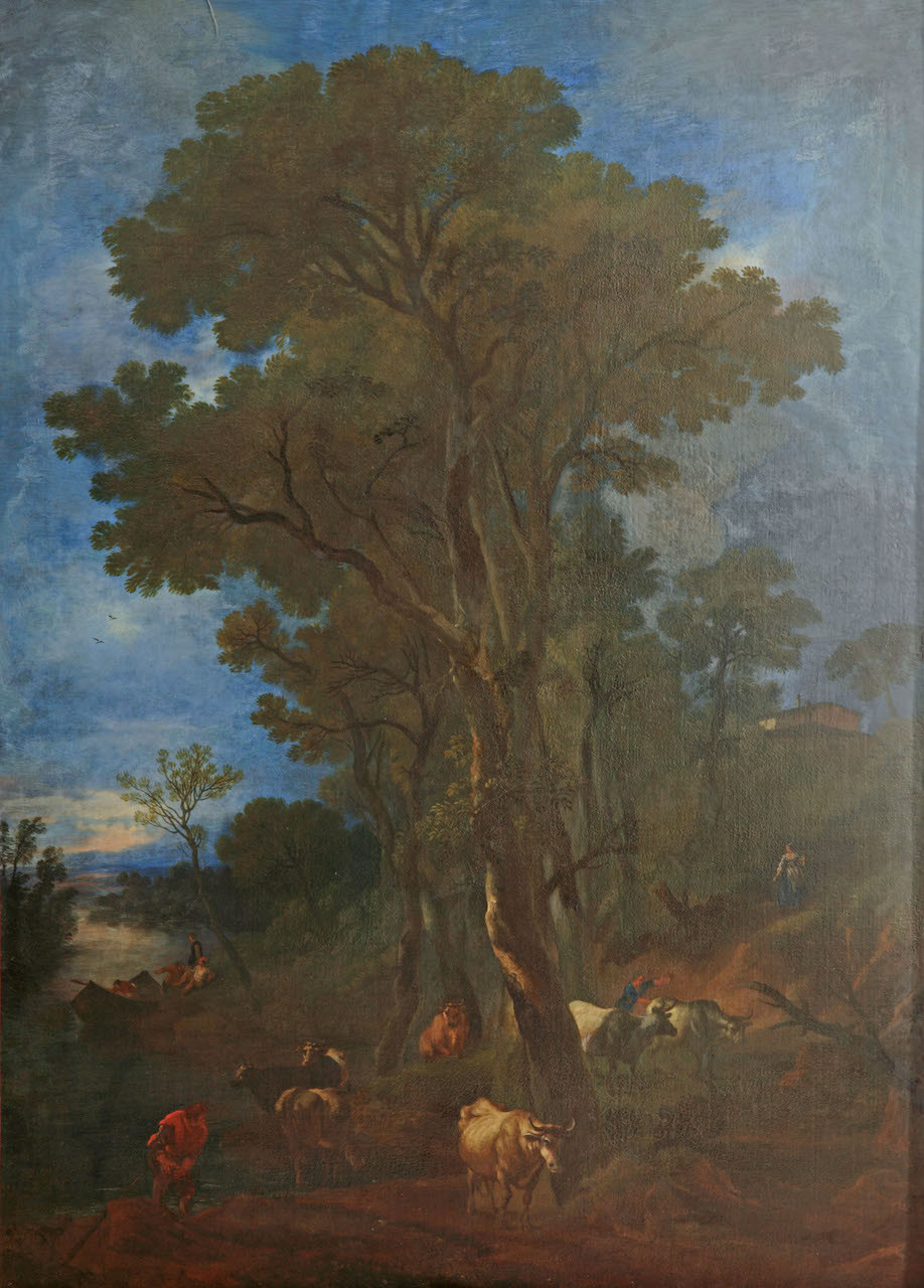 - NOTIZIE STORICO CRITICHE Il dipinto si trovava nell'appartamento del Gran Principe Ferdinando in Palazzo Pitti insieme al suo pendant raffigurante un Paese con figure (o Ritorno dalla caccia) ora alla Galleria degli Uffizi (inv. 1890 n. 5405; N. Barbolani di Montauto, Pandolfo Reschi, Firenze 1996, pp.102-103, n. 55). Entrambe le tele figurano, infatti, nell'inventario dei quadri della reggia medicea del 1697-1708 dove sono descritte nel modo seguente: "Un quadro del medesimo autore [Pandolfo Reschi], che rappresenta un paese con un signore a cavallo, con seguito d'altra gente a cavallo et a piedi, con cani, alto braccia due e soldi quindici, largo braccia due e soldi uno con suo adornamento dorato" (inv. 1890 n. 5405) e "Un quadro del medesimo autore che rappresenta un paese con alcuni alberi nel mezzo et alcuni bovi, con alcuni uomini et una contadina che fila, in atto di andare verso alcune case su un monte e da una banda vi è un fiume con una barca e pescatori, della medesima misura. Col medesimo adornamento" (ASF, GM 1185, c. 133, nn. 111-112). Ancora in coppia sono ricordate nell'inventario redatto alla morte del Gran Principe nel 1713 (ASF, GM 1222, cc. 6v-7r). Il 20 maggio 1774 passarono entrambe alla Galleria degli Uffizi (cfr. in "Dalle collezioni all'arredo. Opere dei musei negli uffici e nelle sedi di rappresentanza dello Stato", catalogo della mostra [Roma, Complesso monumentale di San Michele, Sala degli Aranci, 8 aprile-11 maggio 1997], a cura di G. Pezzini Bernini, Roma 1997, p. 39, n. 8). La tela qui considerata fu concessa in deposito alla Camera dei Deputati nel 1925. Essa, con la sua compagna, potrebbe essere stata commissionata direttamente da Ferdinando che entrò in contatto con Pandolfo Reschi tramite lo zio, il cardinale Francesco Maria de' Medici, protettore e principale committente del pittore. La gamma cromatica e il brio della pennellata suggeriscono una datazione intorno al 1690-1695 circa